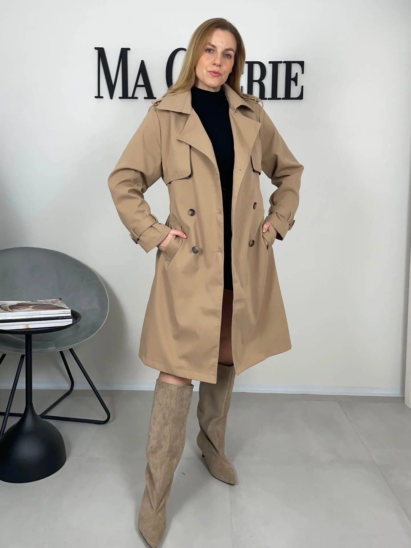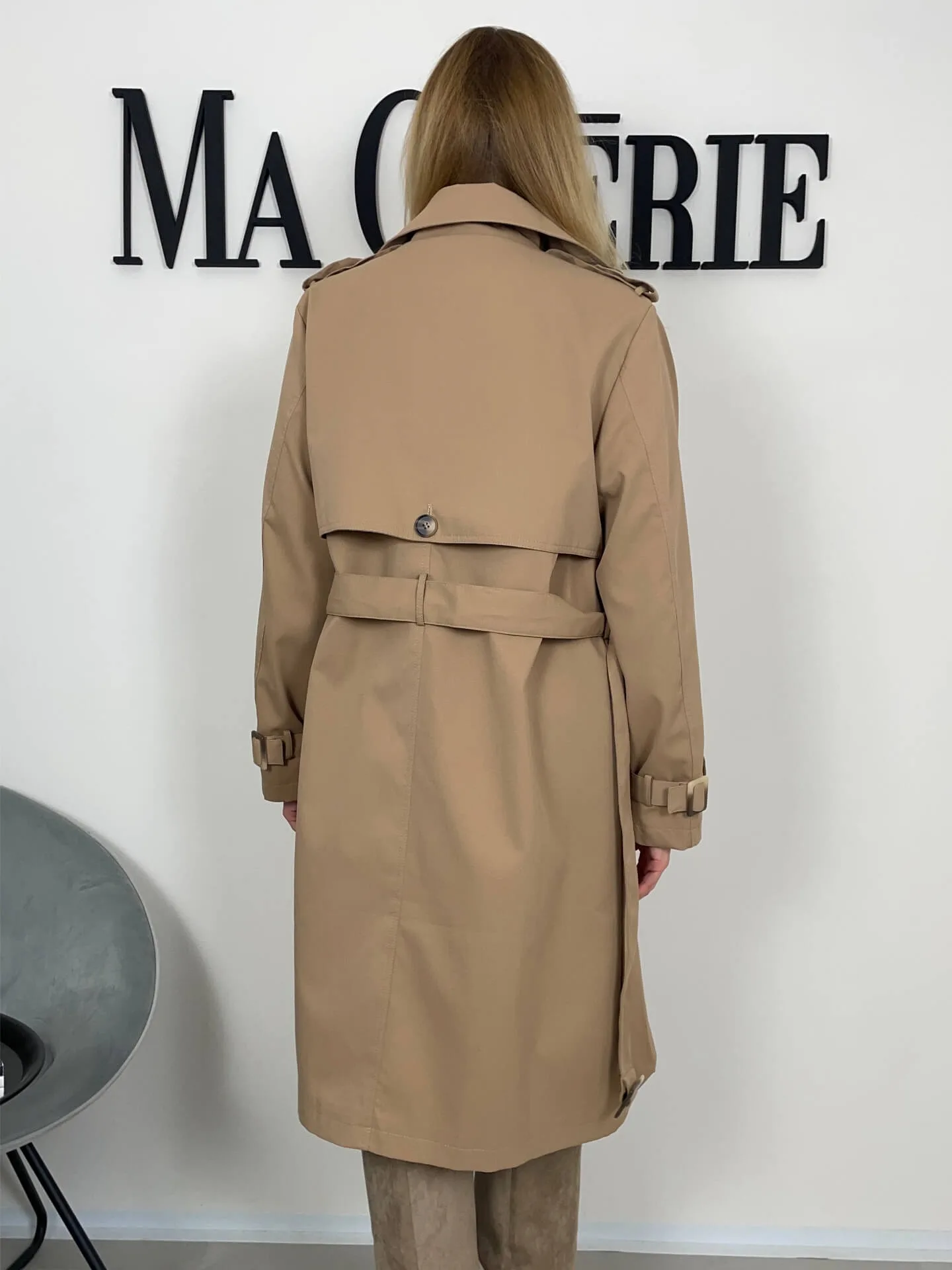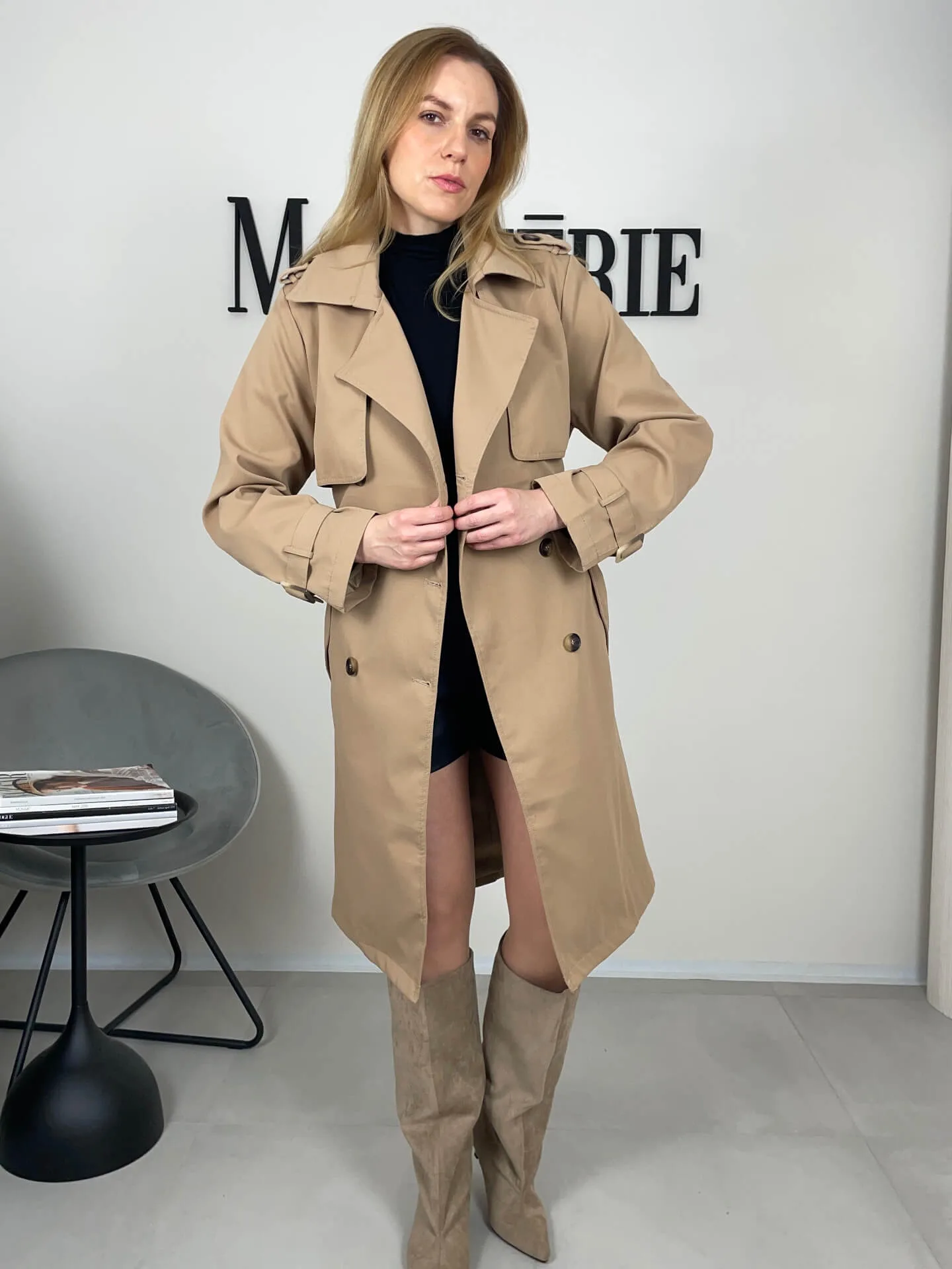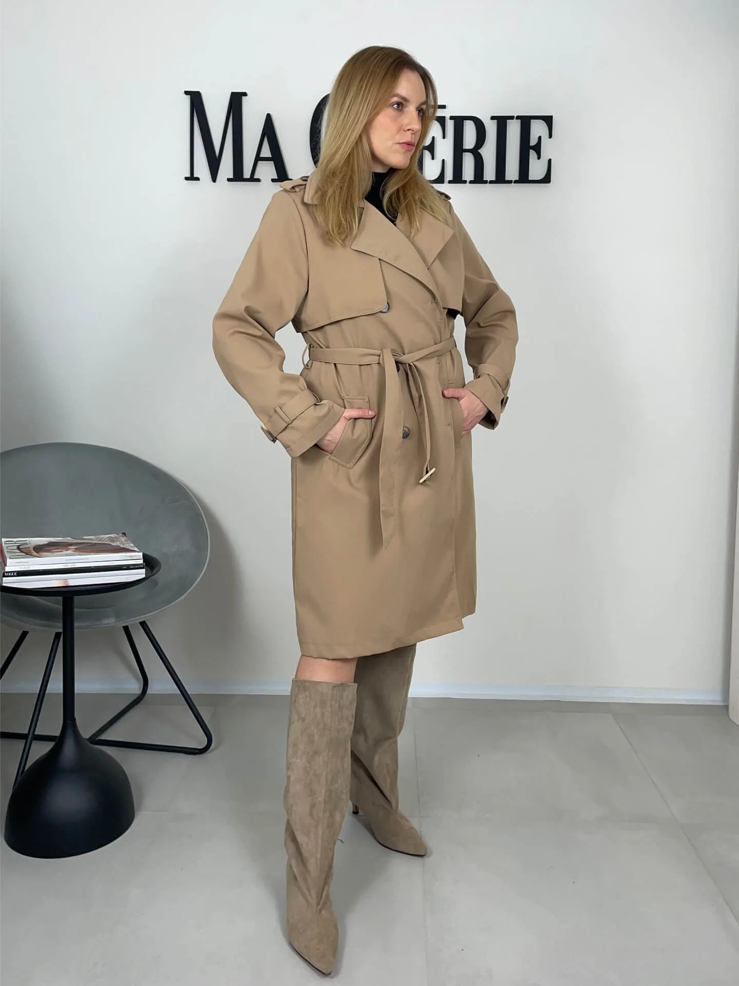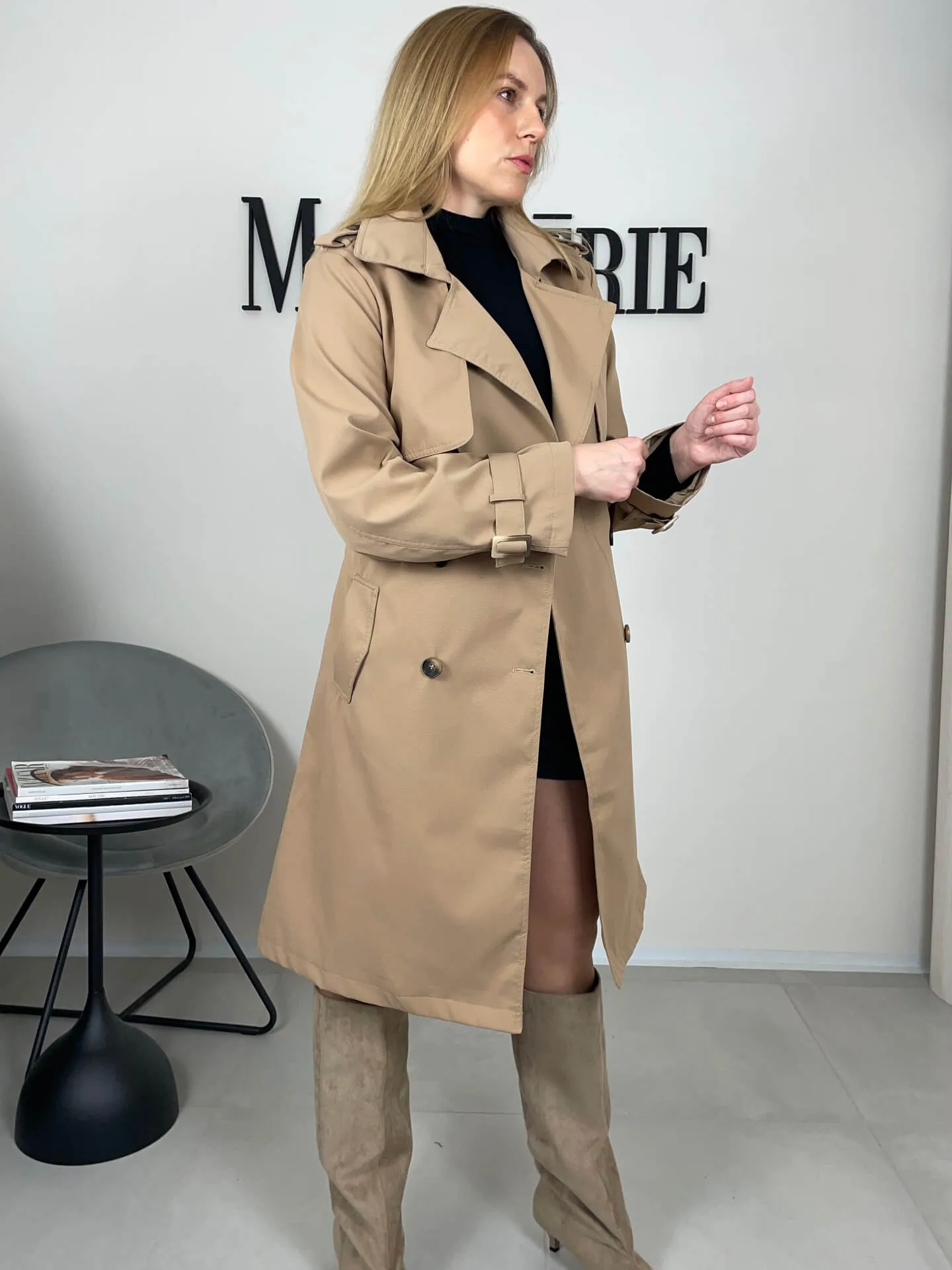 Dlouhý trenchcoat s páskem, dvouřadé zapínání, kvalitní pevný materiál, postranní kapsy, s podšívkou.