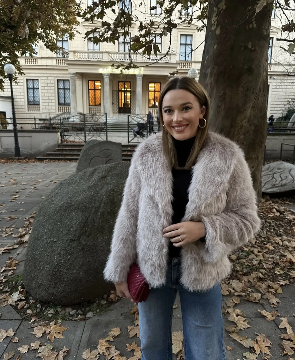 Krásný umělý kožíšek v béžové barvě s velkým límcem, bez zapínání, postranní kapsy, má podšívku.
