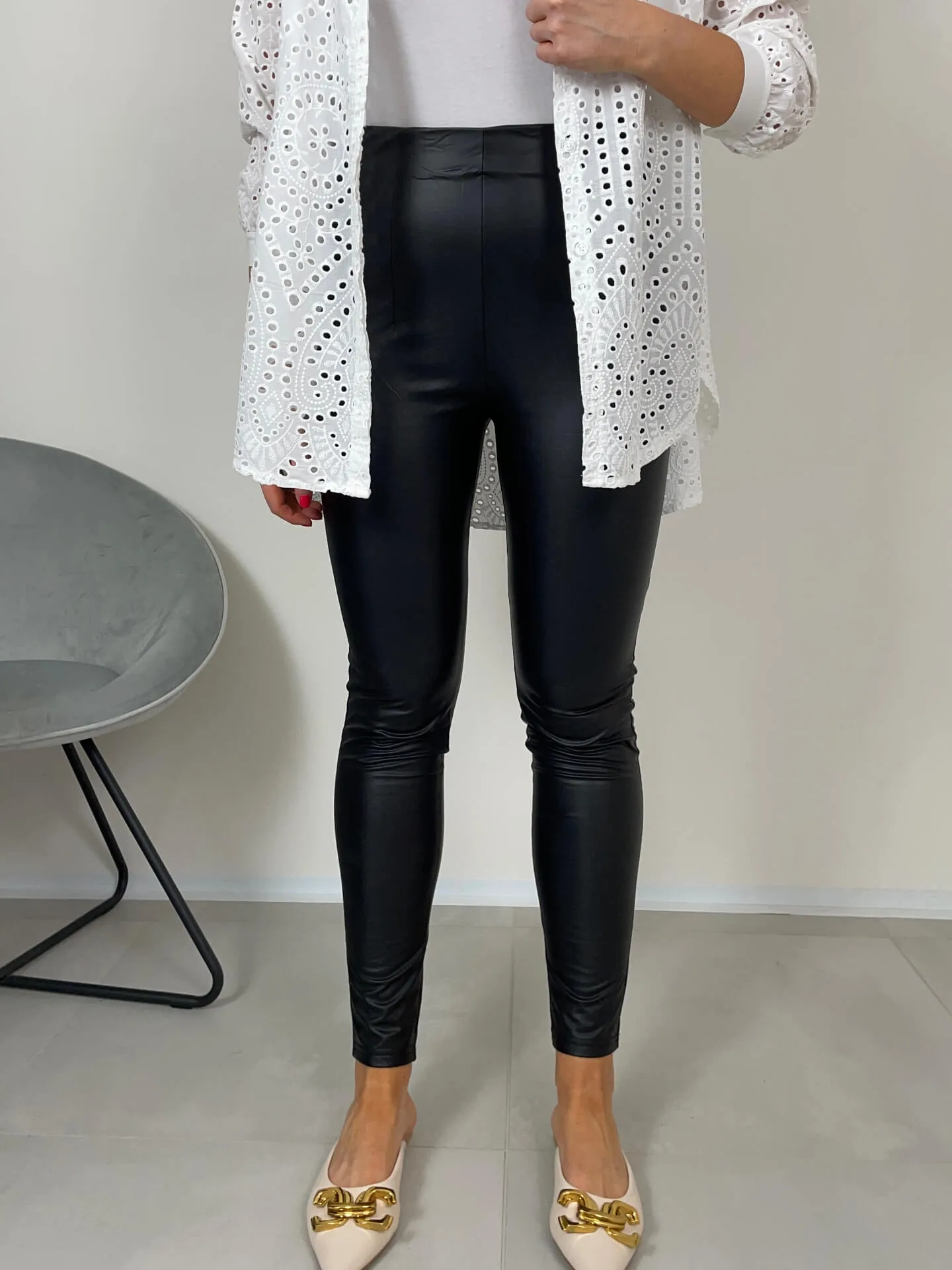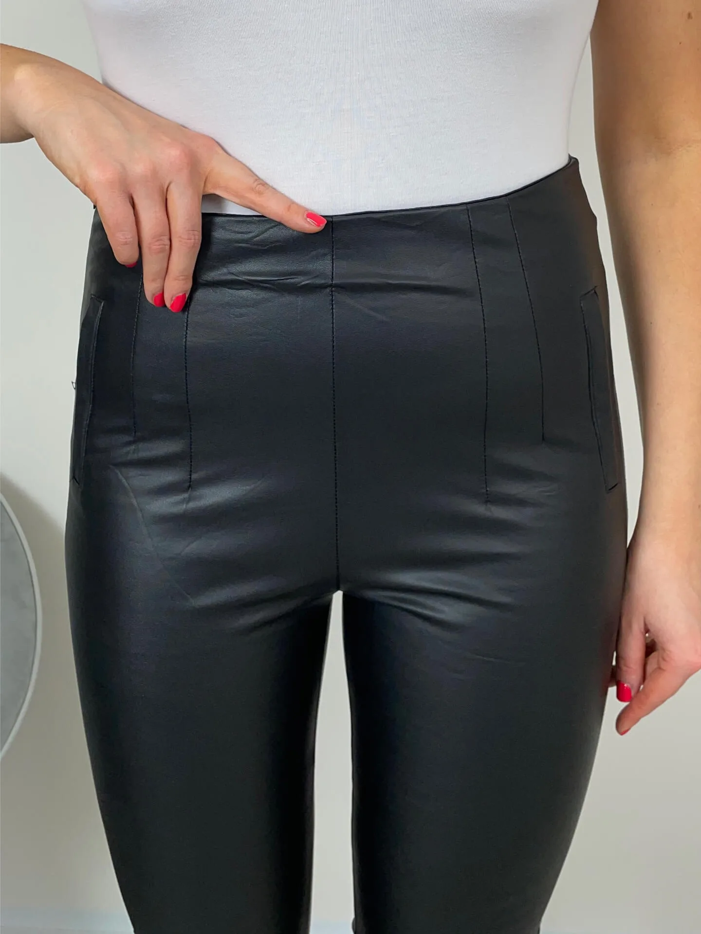Černé koženkové legíny, zapínání na zip, lehce pruží, po stranách falešné kapsy.