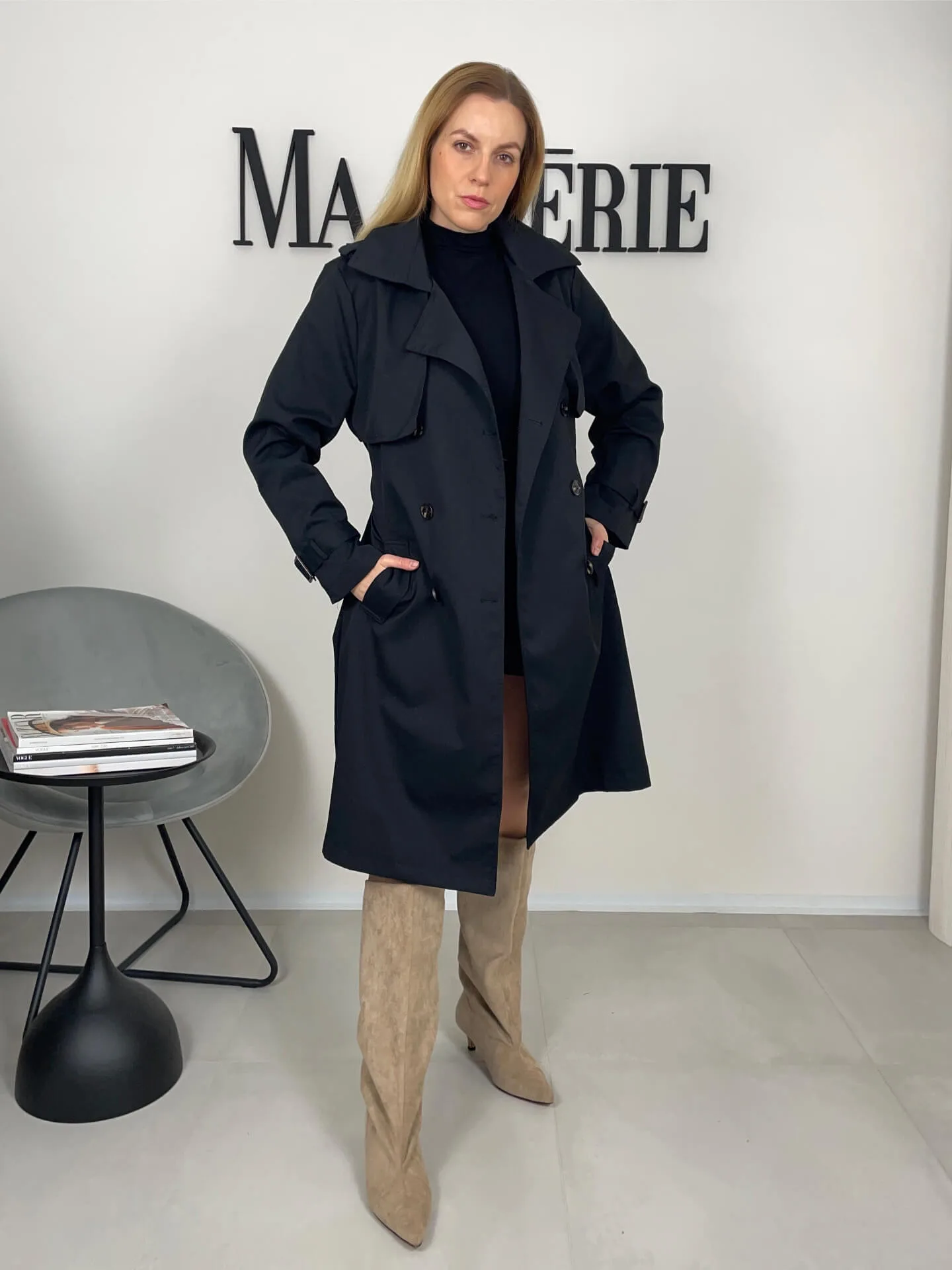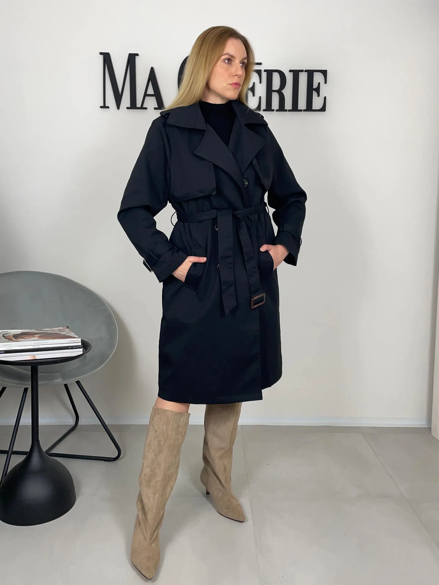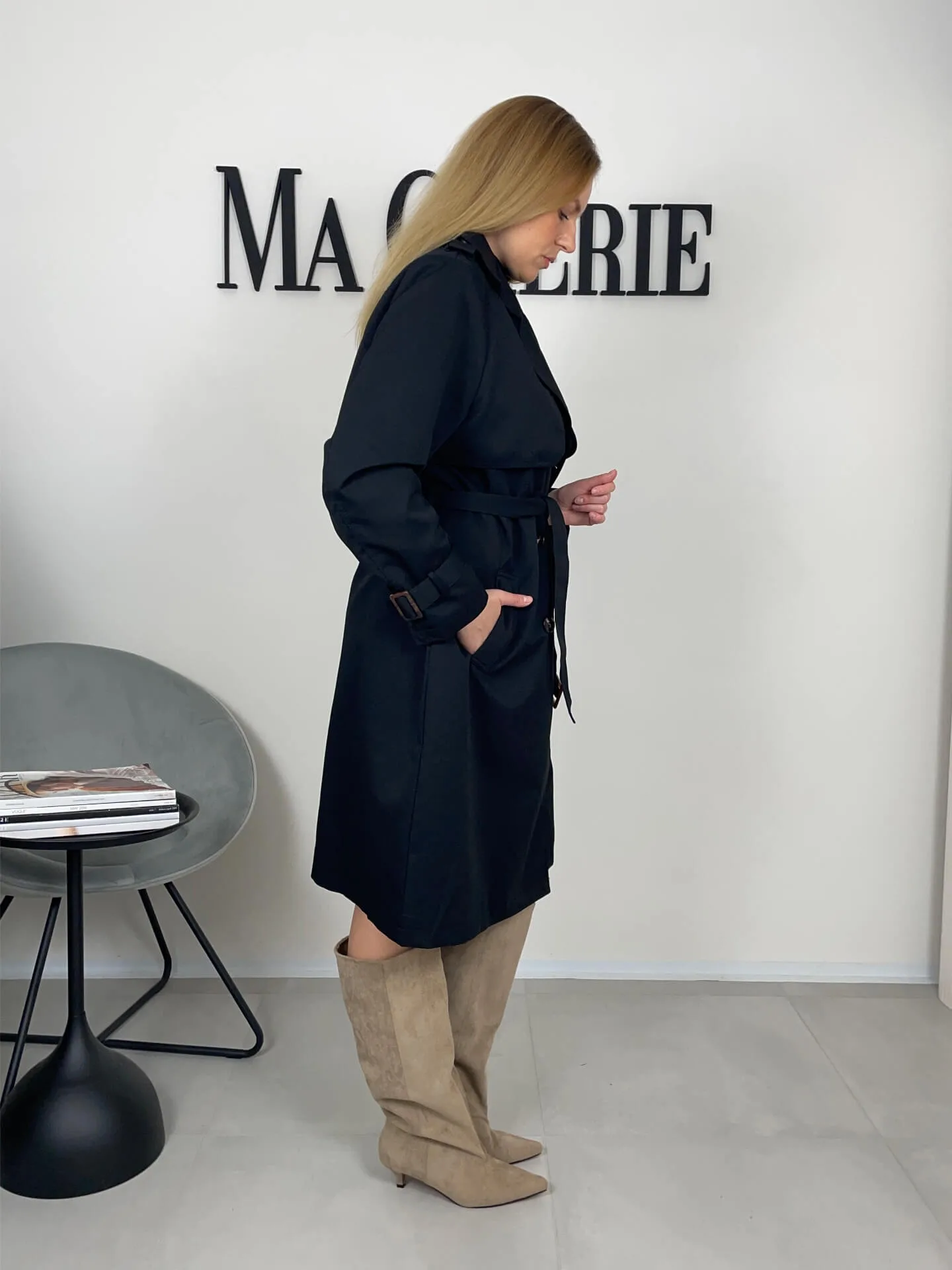 Dlouhý trenchcoat s páskem, dvouřadé zapínání, kvalitní pevný materiál, postranní kapsy, s podšívkou.