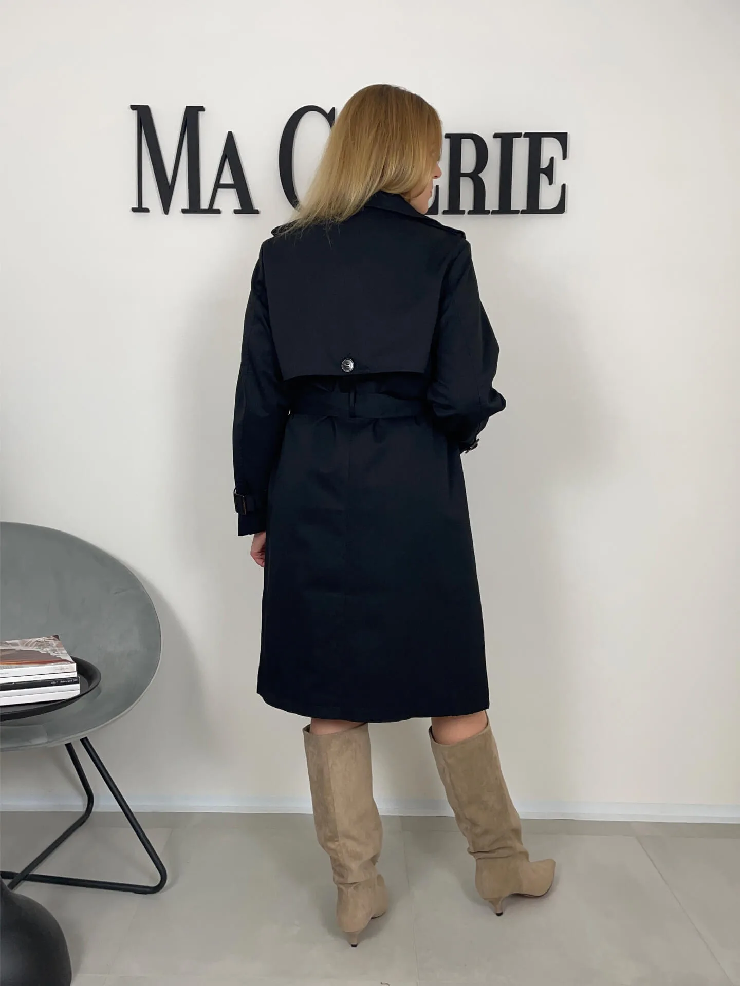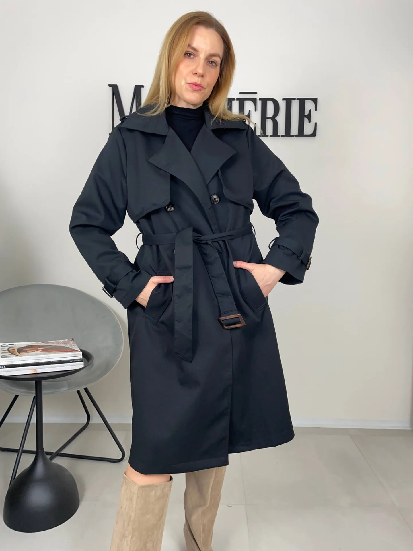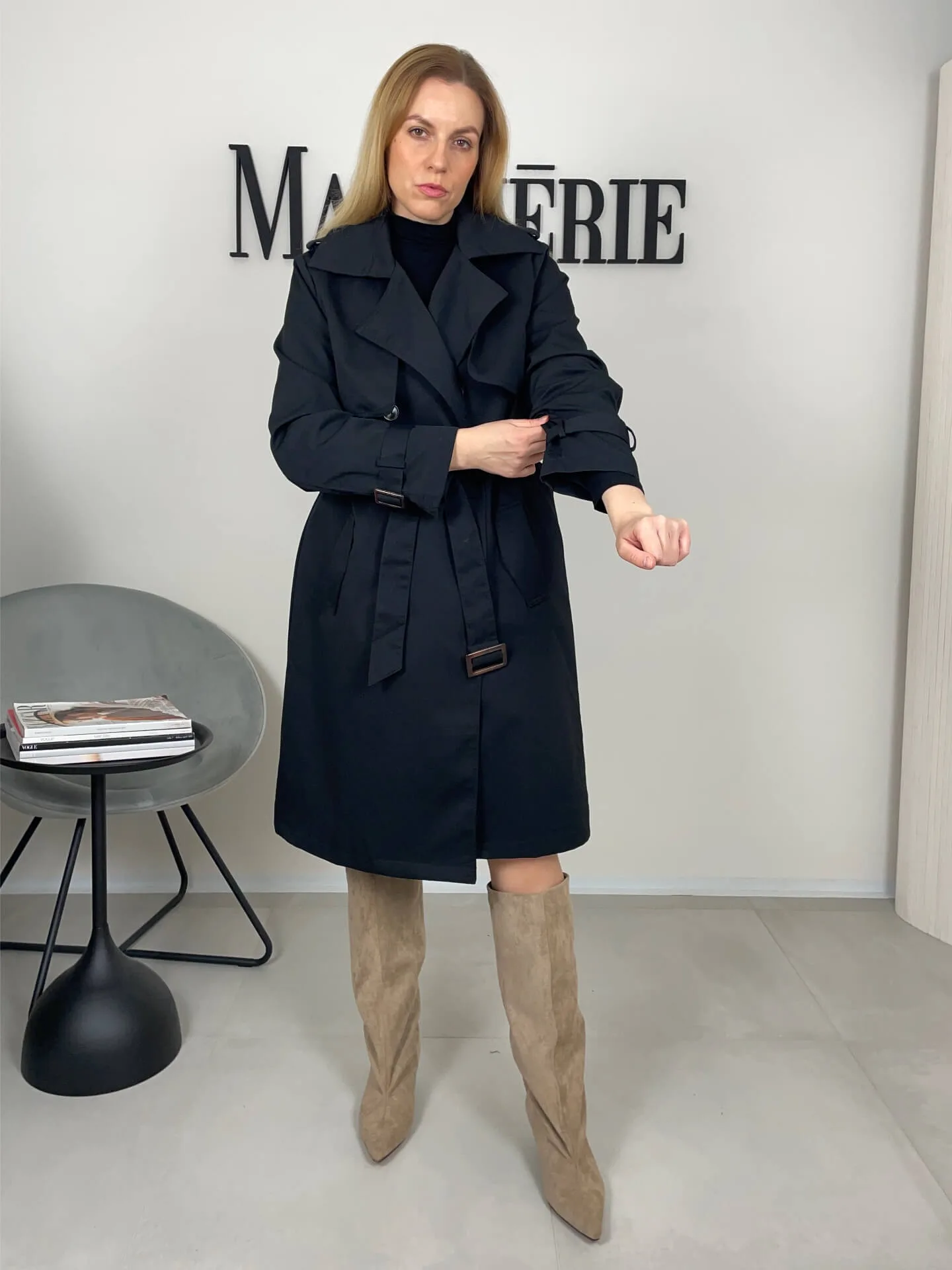 Dlouhý trenchcoat s páskem, dvouřadé zapínání, kvalitní pevný materiál, postranní kapsy, s podšívkou.