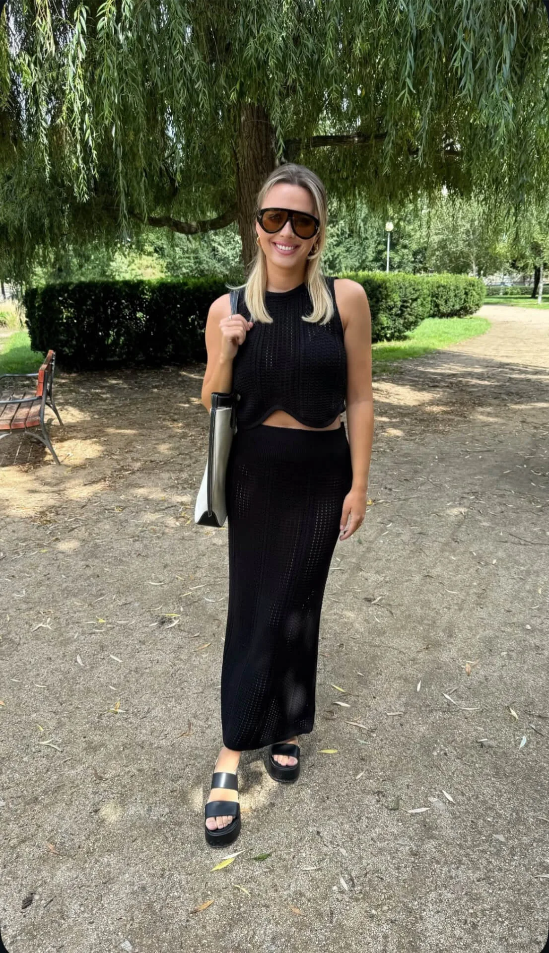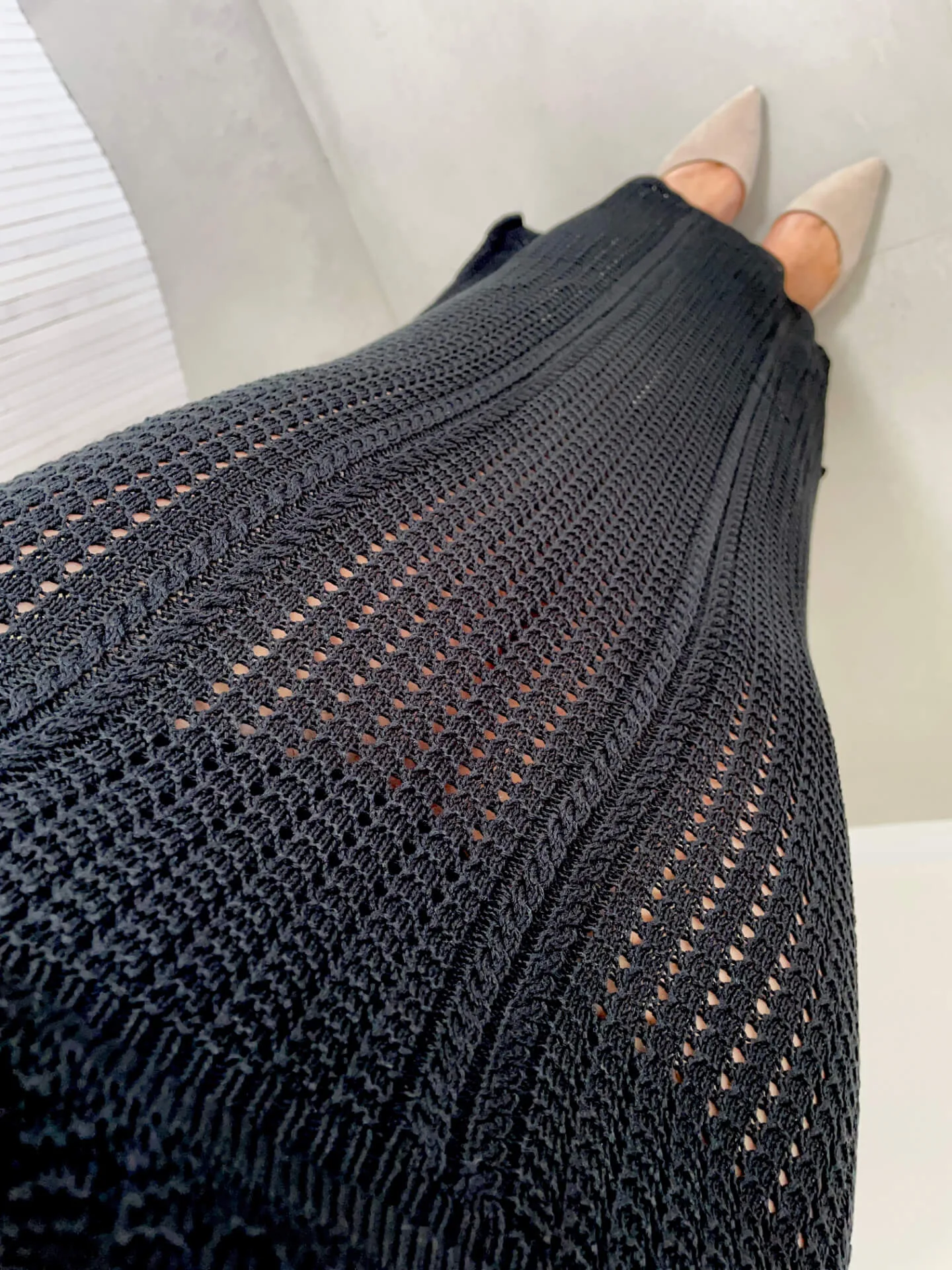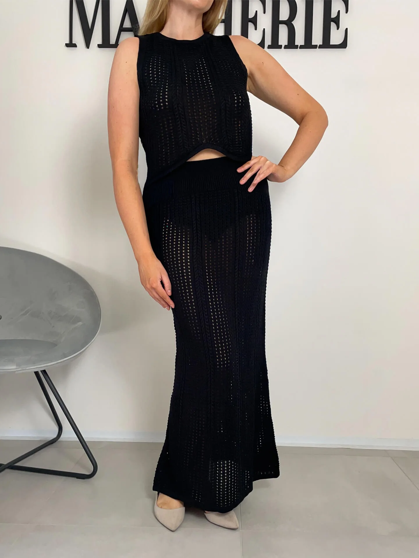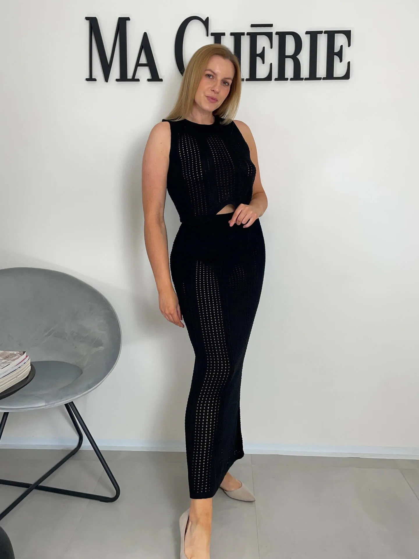 Pletený komplet dlouhé sukně s topem, top má zapínání za krkem a rafinovaný prostřih na zádech, komplet je bez podšívky, materiál je hodně pružný a lehce průsvitný.