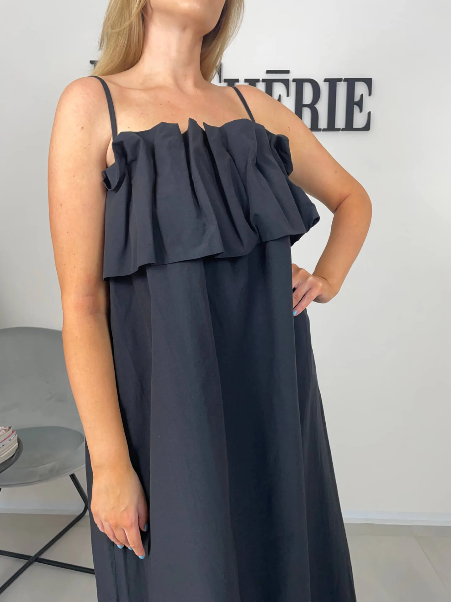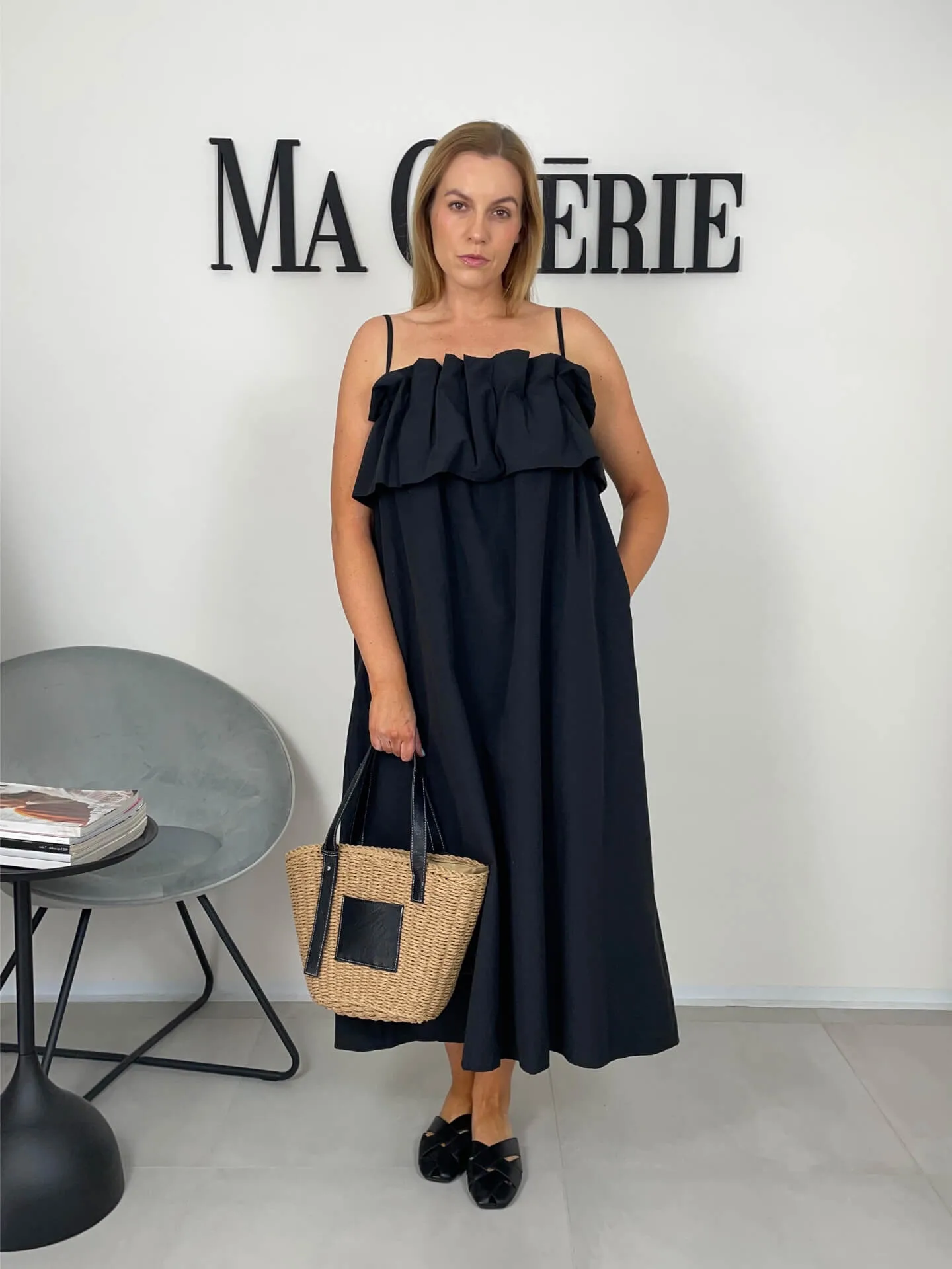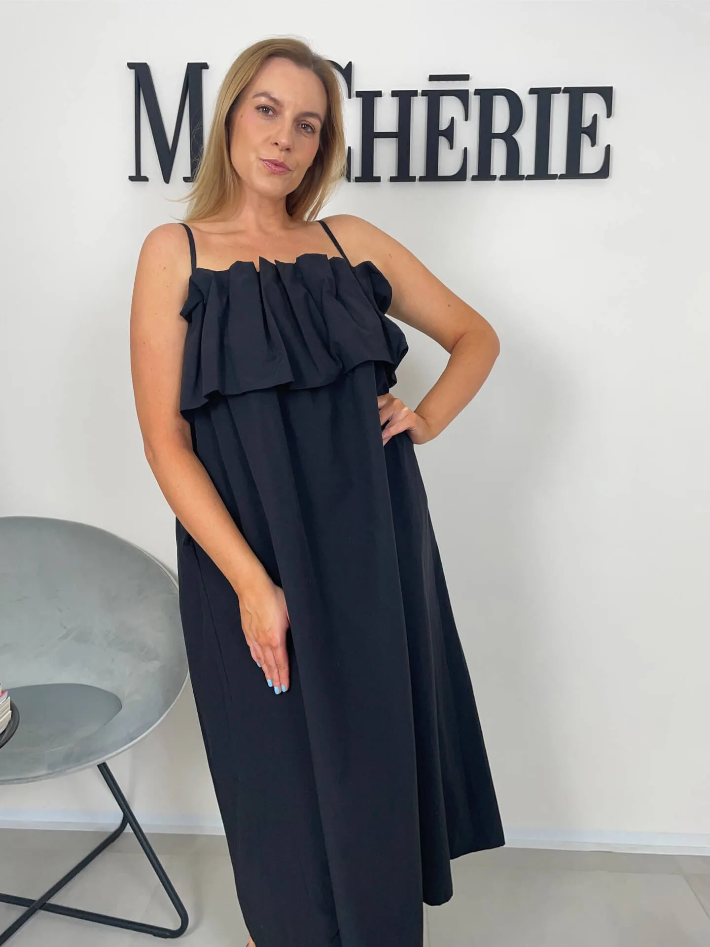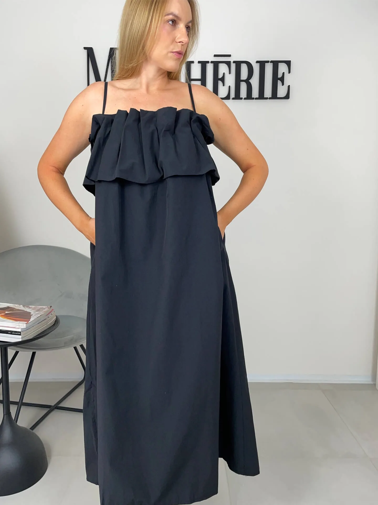 Dlouhé černé šaty balónového střihu na ramínka, přes prsa je pružná guma, šaty mají podšívku a postranní kapsy.