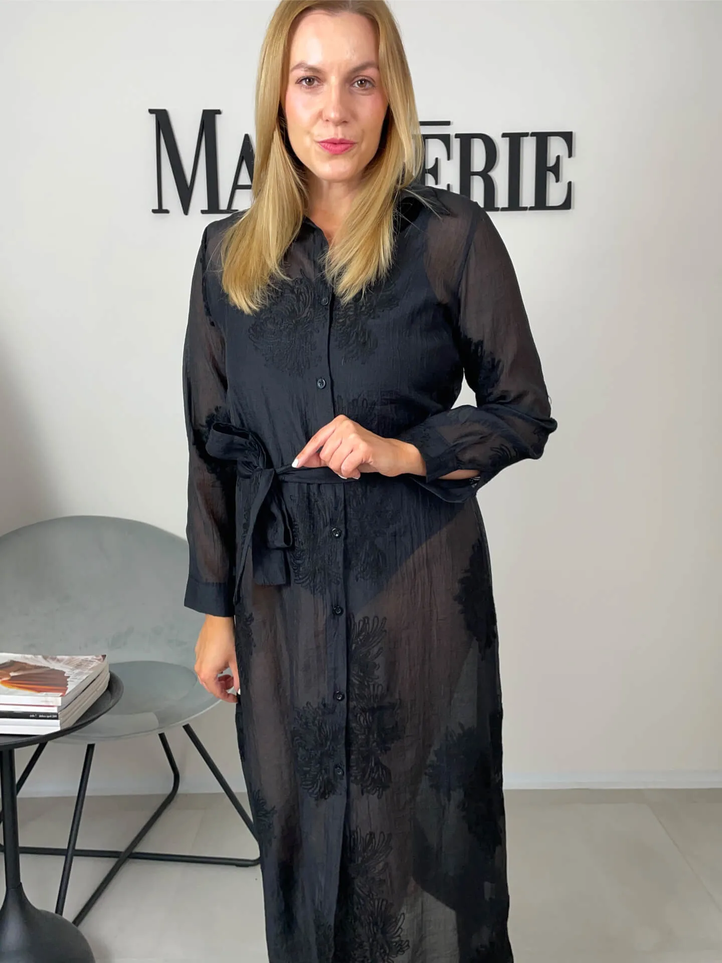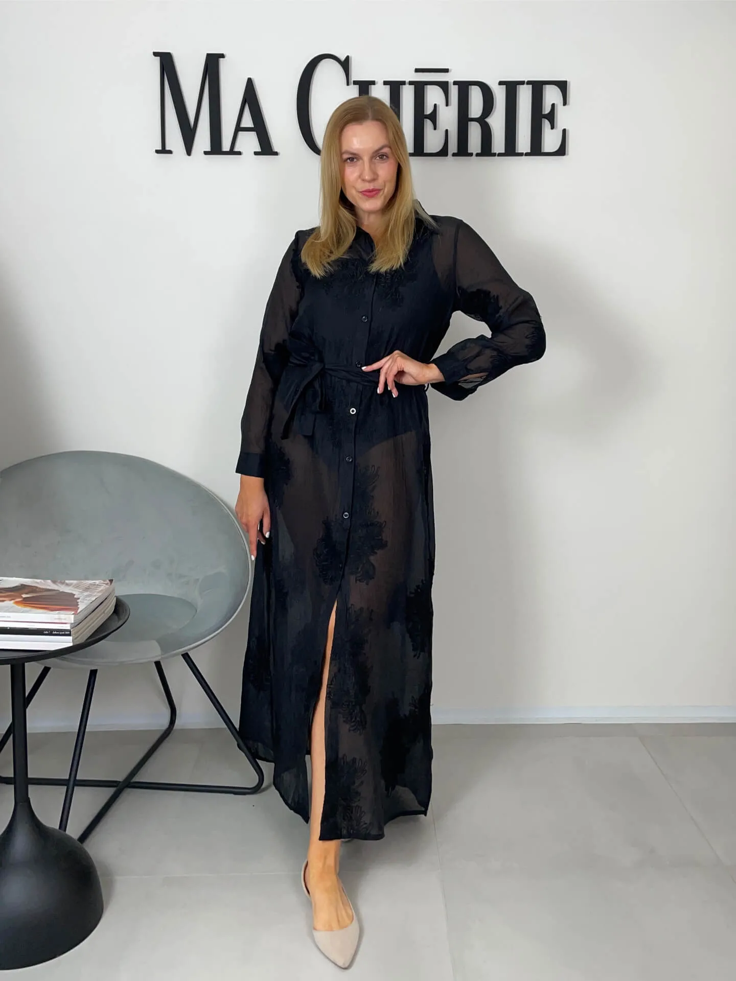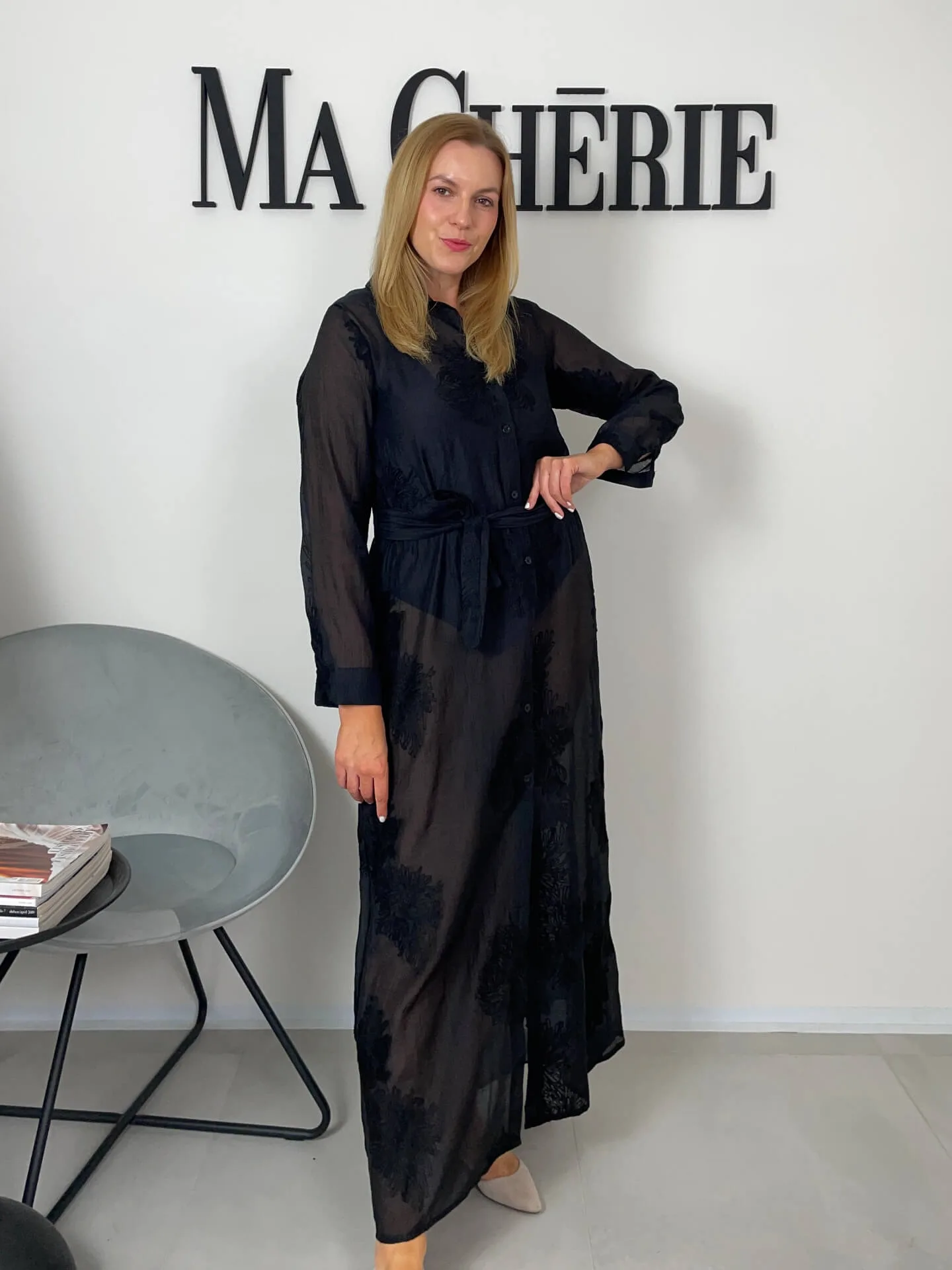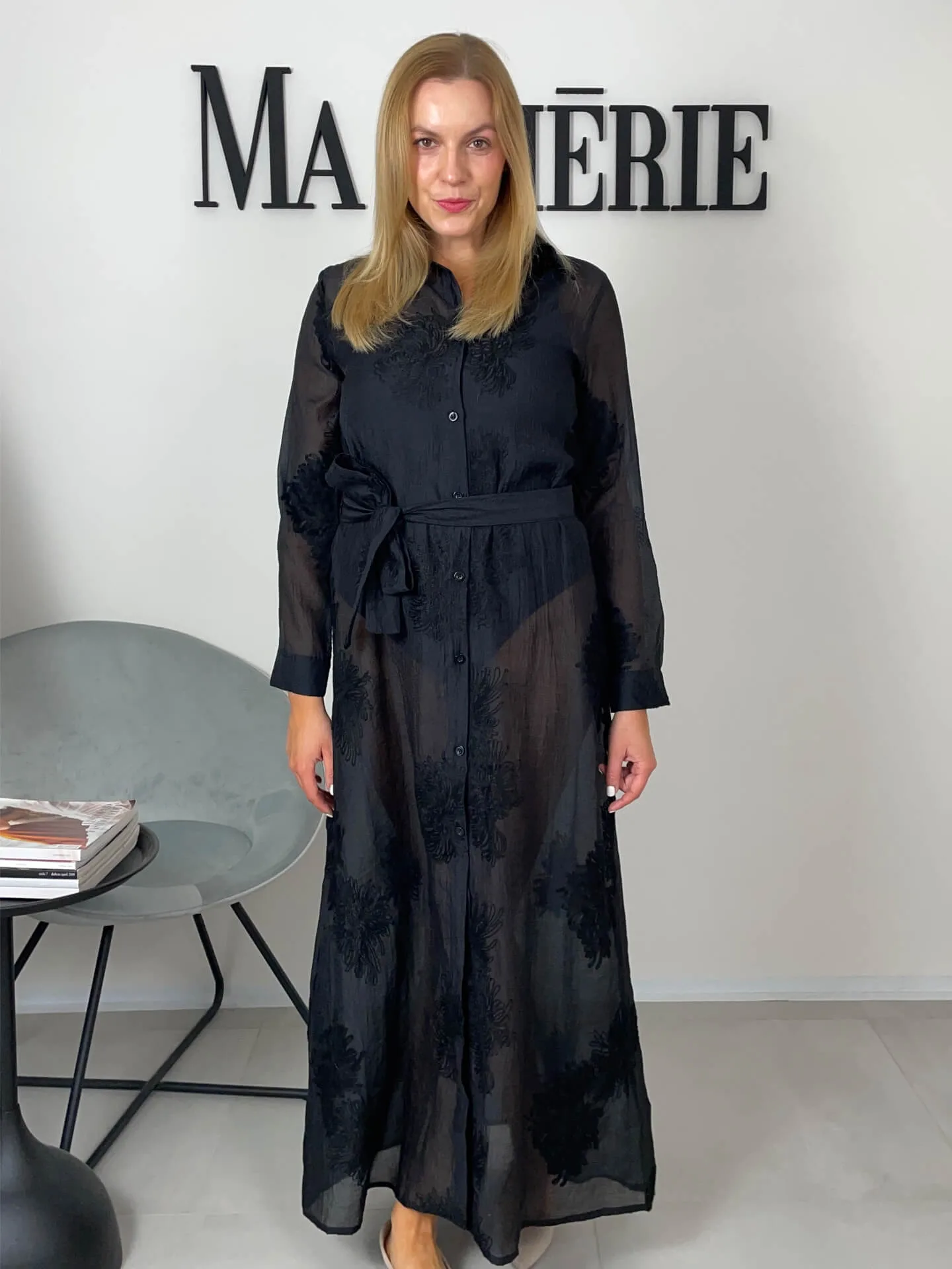 Dlouhé černé košilové šaty s květinovým vzorem, průsvitné, zapínání na knoflíky, bez podšívky, v pase pásek na stažení, lze vzít jako přehoz na plavky.