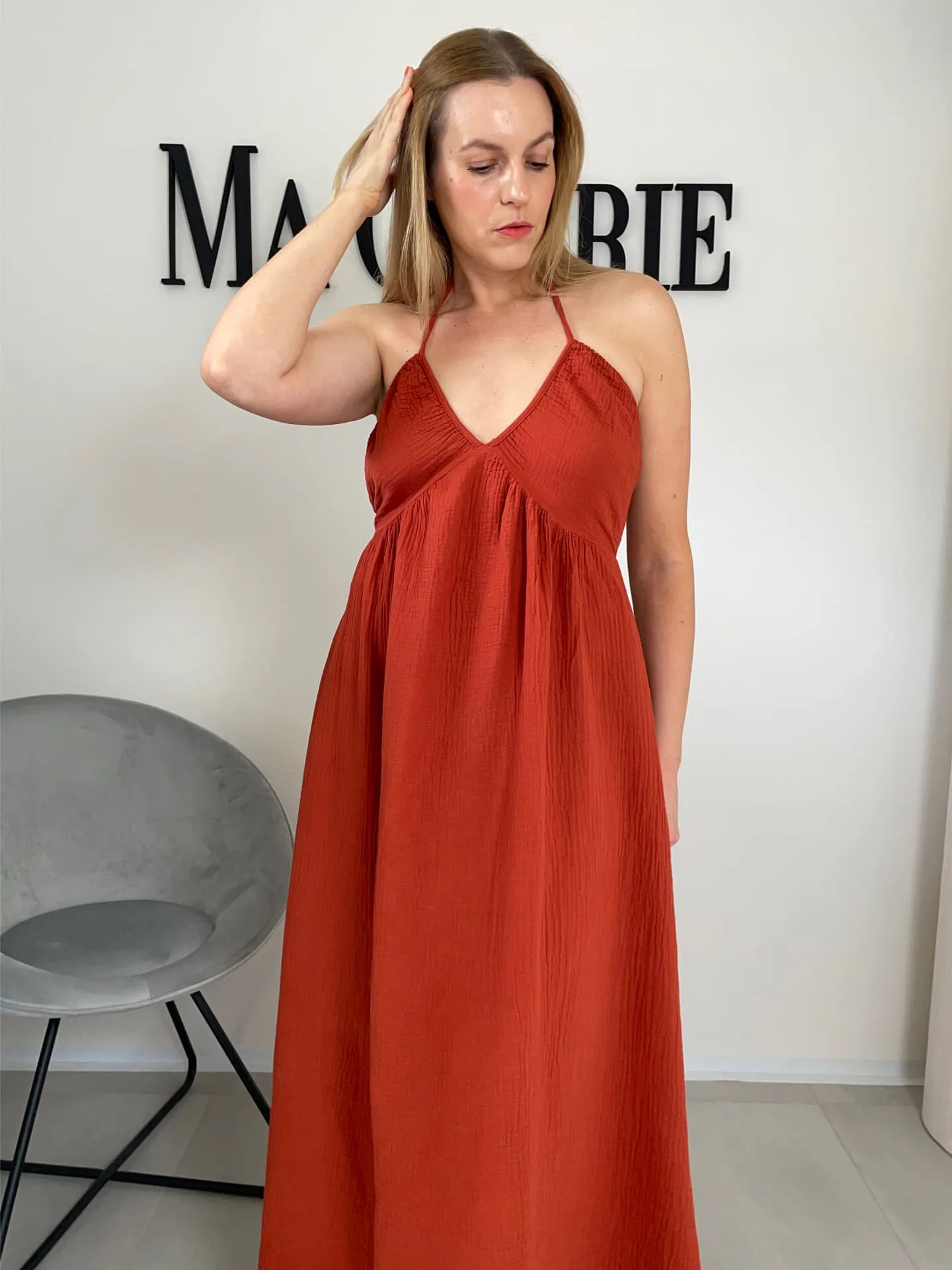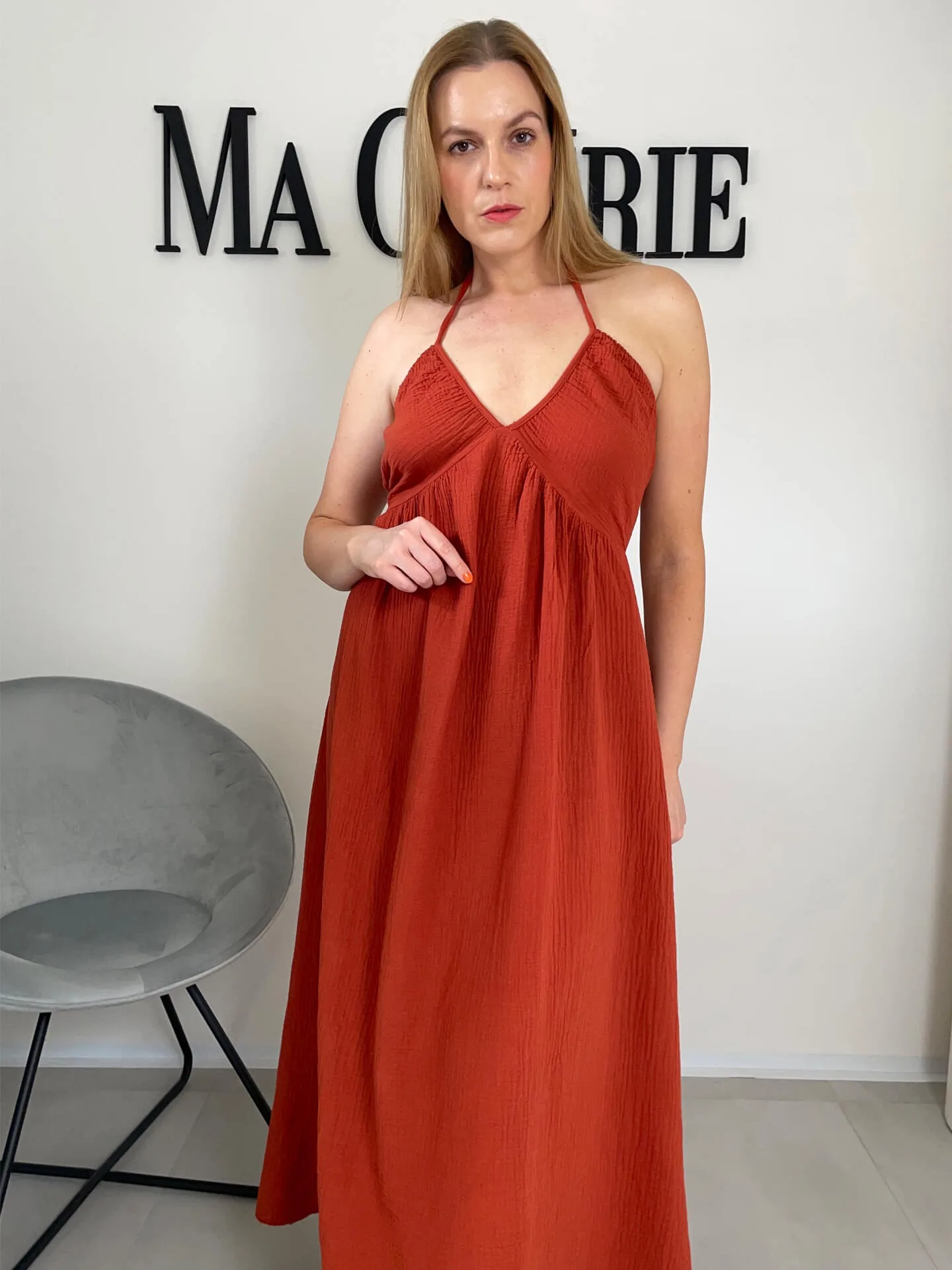 Dlouhé mušelínové šaty na zavazování za krk, lze zavázat na více způsobů, výrazná cihlová barva, střih sukně do „A“, velmi příjemný vzdušný materiál.