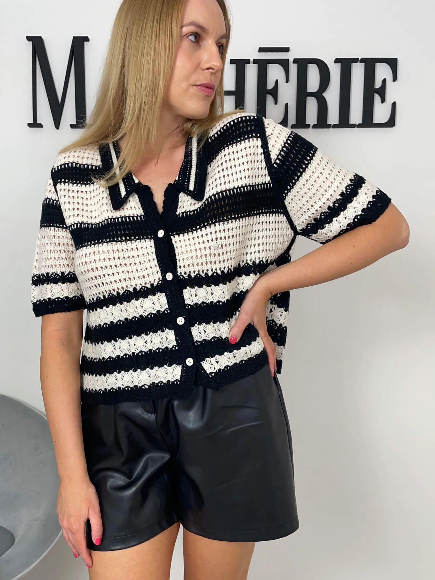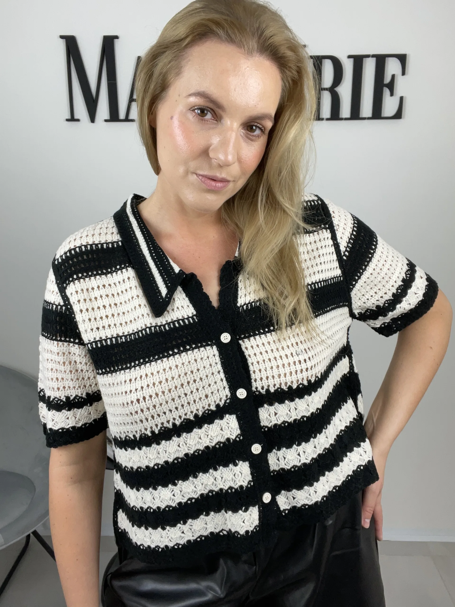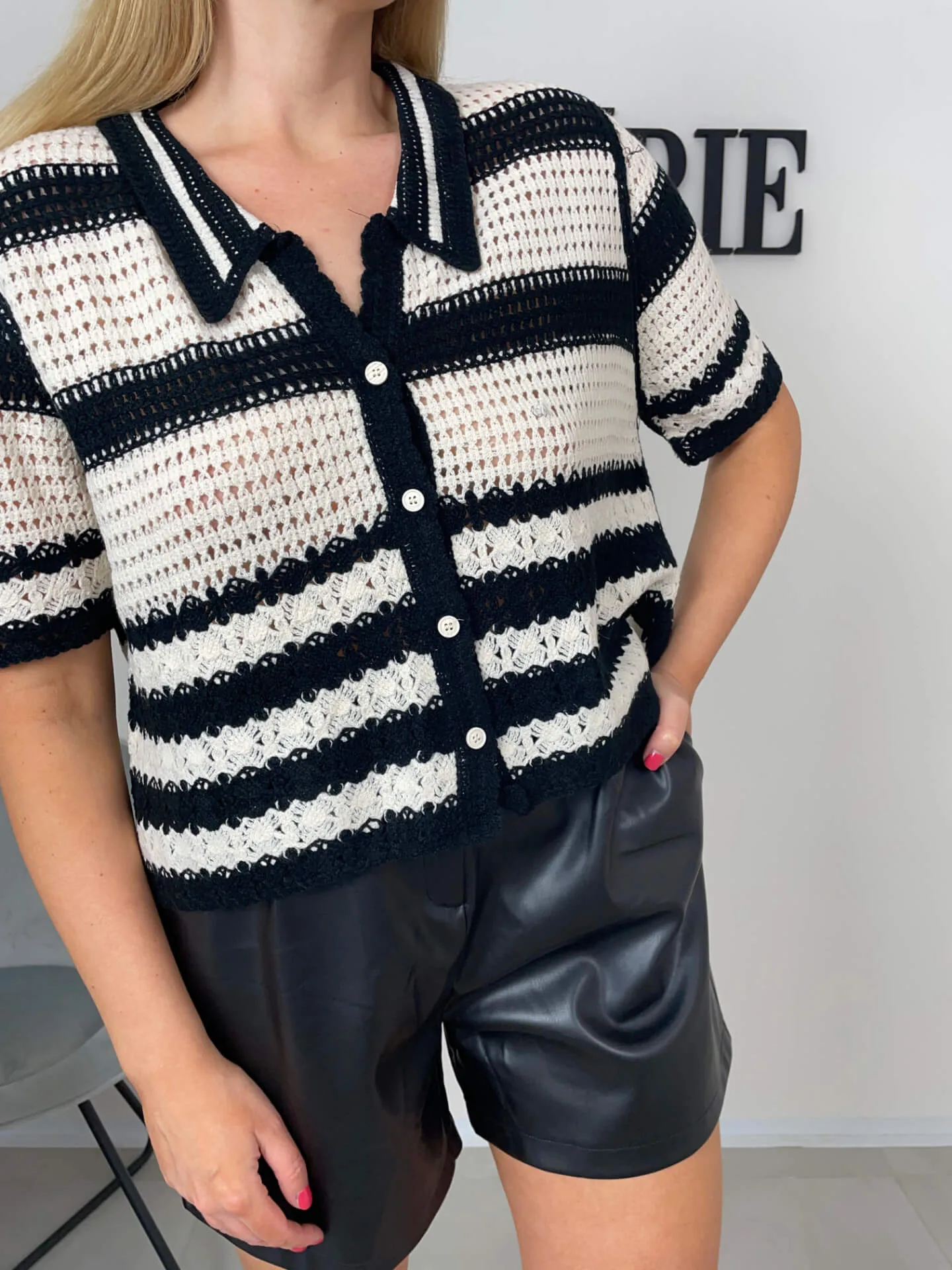 Černo bílý svetr na propínání, kratší volnější střih, s límečkem, kvalitní nekousavý materiál, lehce průsvitný.