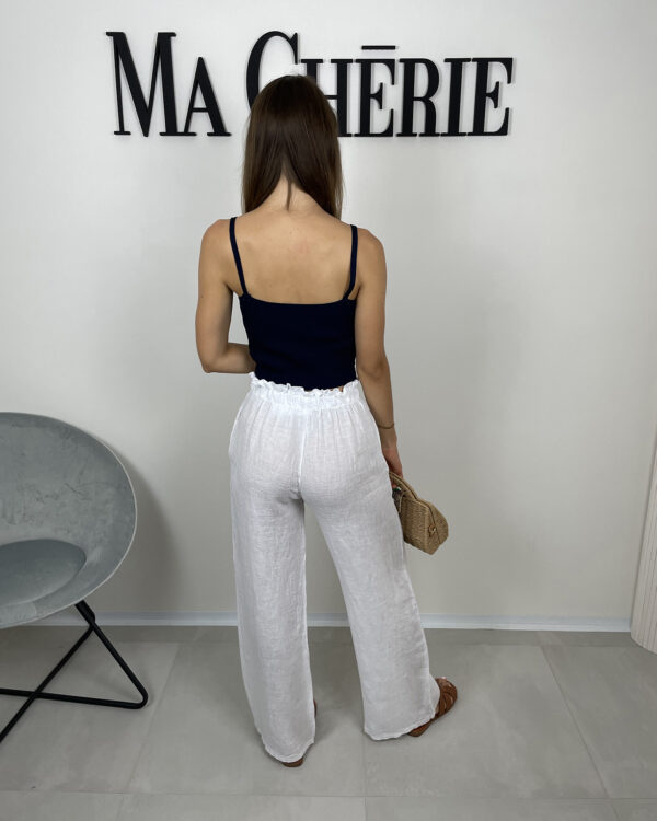 Široké lněné kalhoty, klasická délka, boční kapsy, v pase guma, lehce průsvitné.