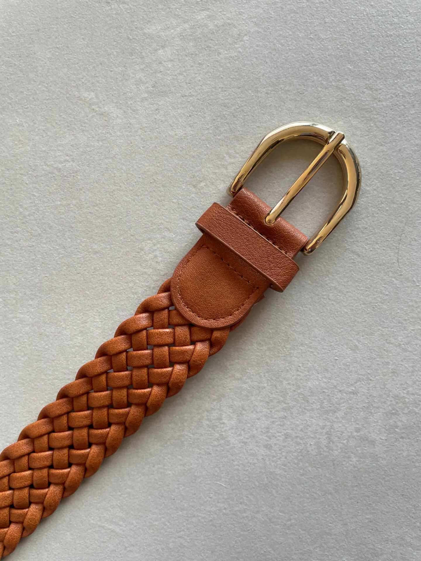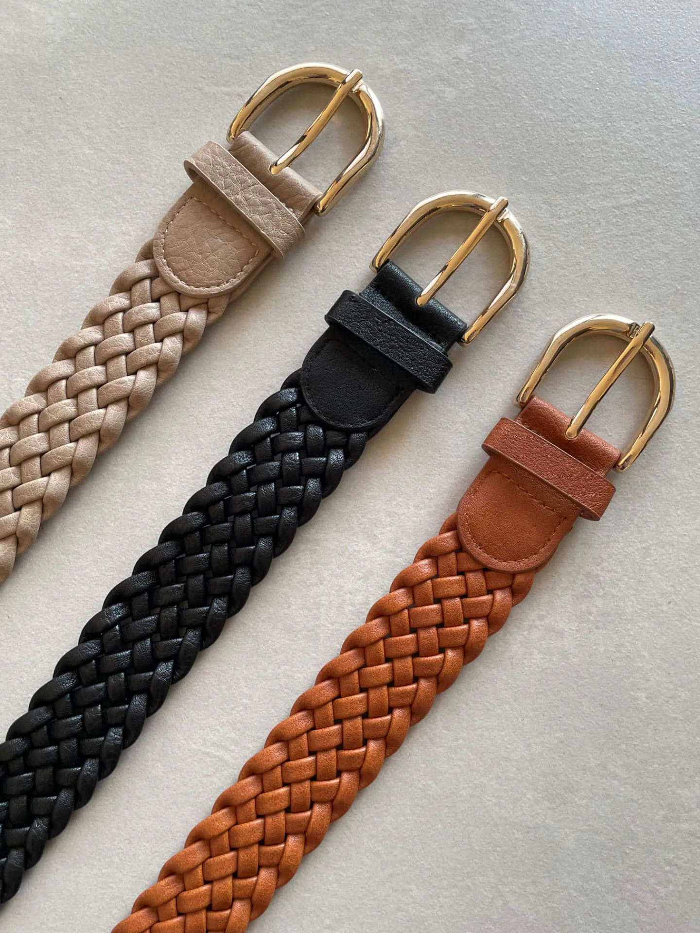 Proplétaný pásek ze zlatou sponou, lehce pruží.