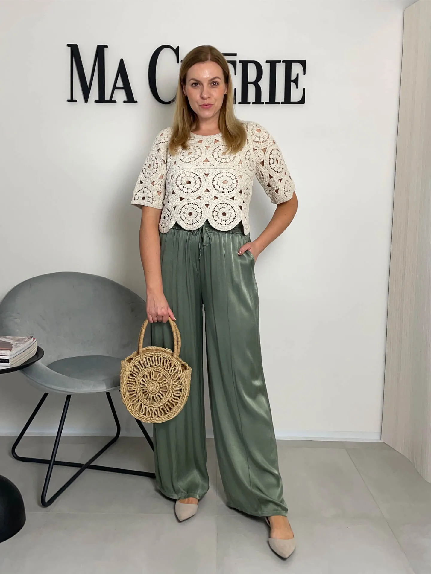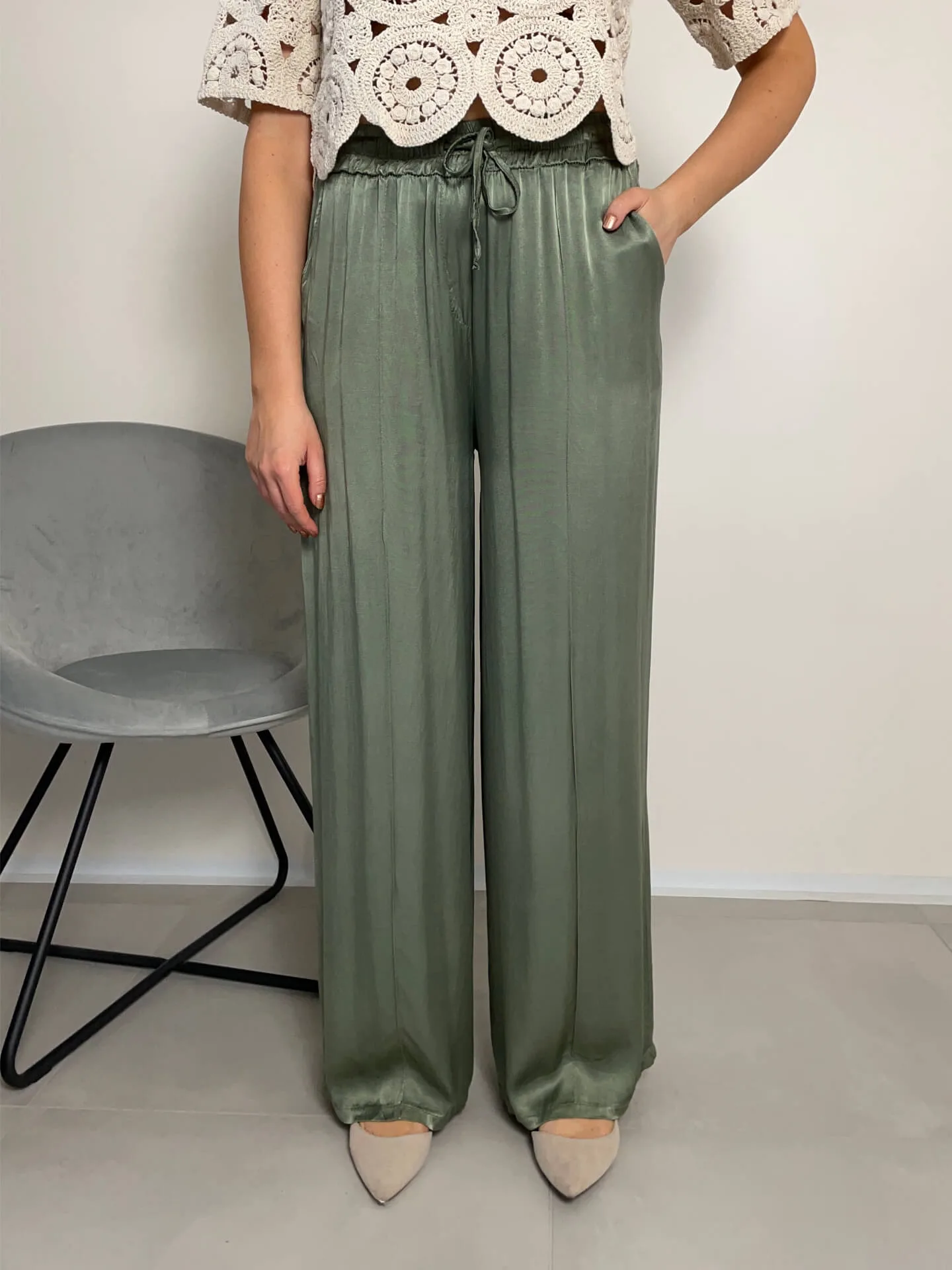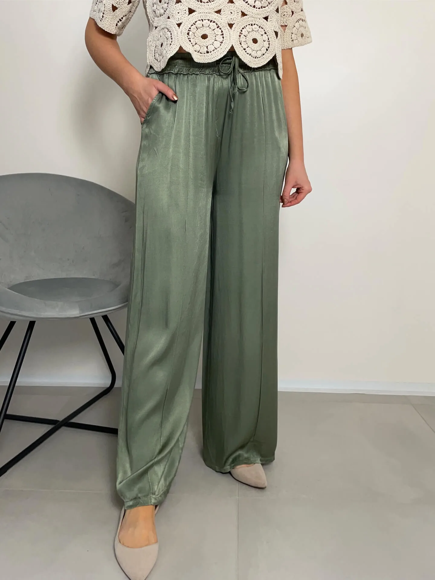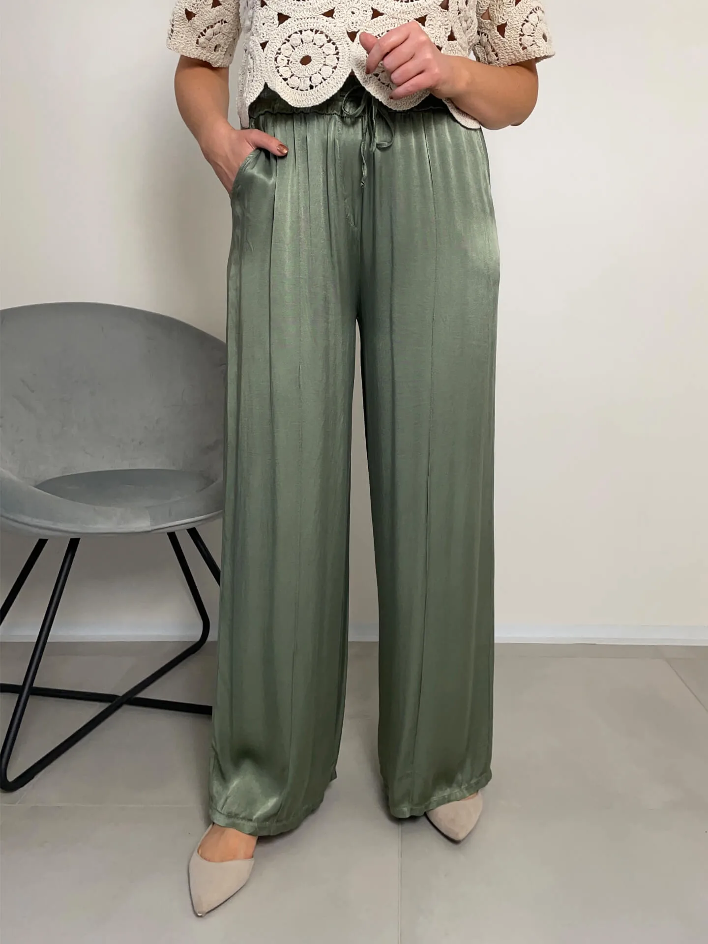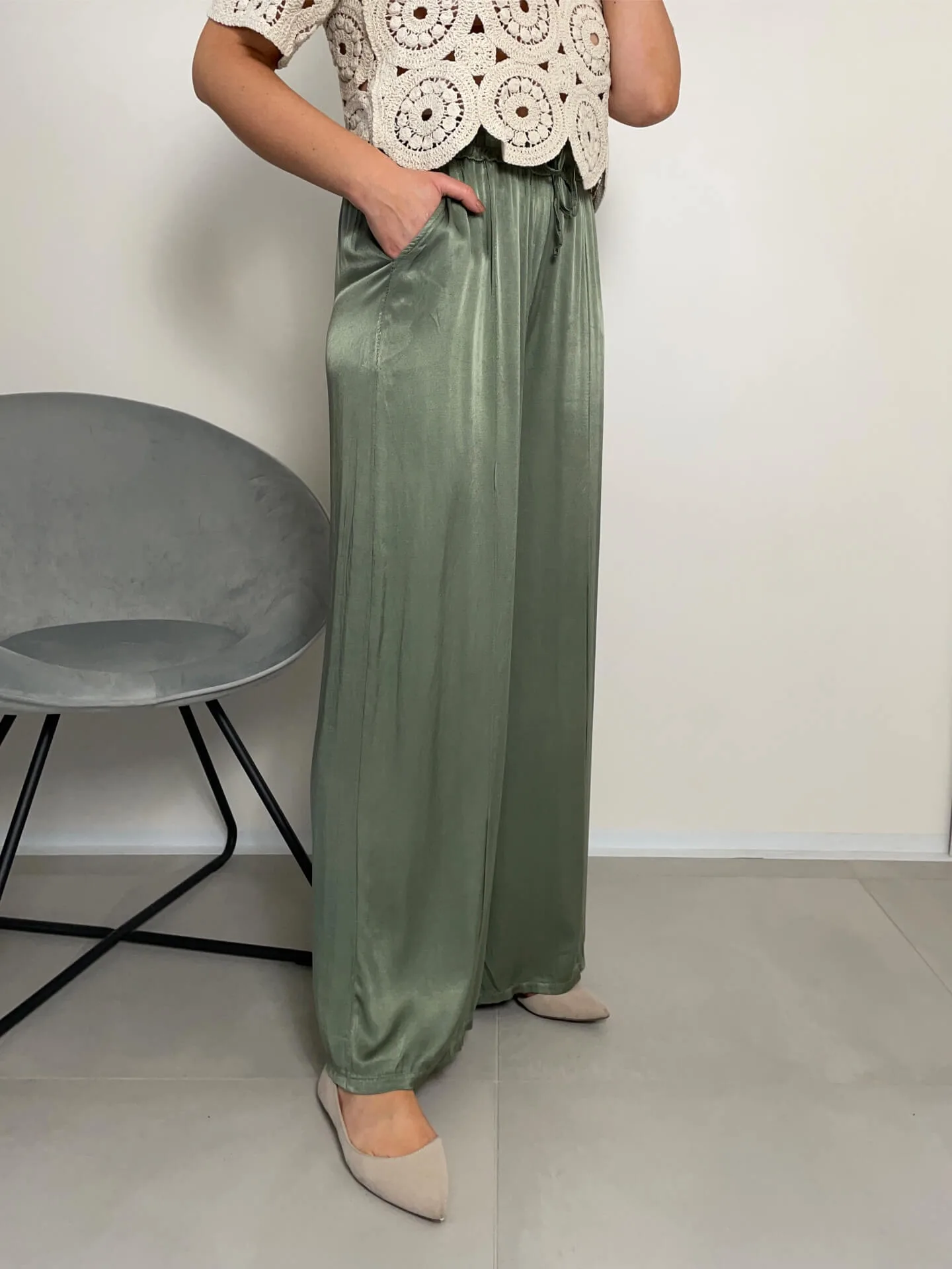 Široké lesklé kalhoty v khaki barvě, extra pohodlné, ideální na léto, boční kapsy, v pase guma, příjemný chladivý materiál.