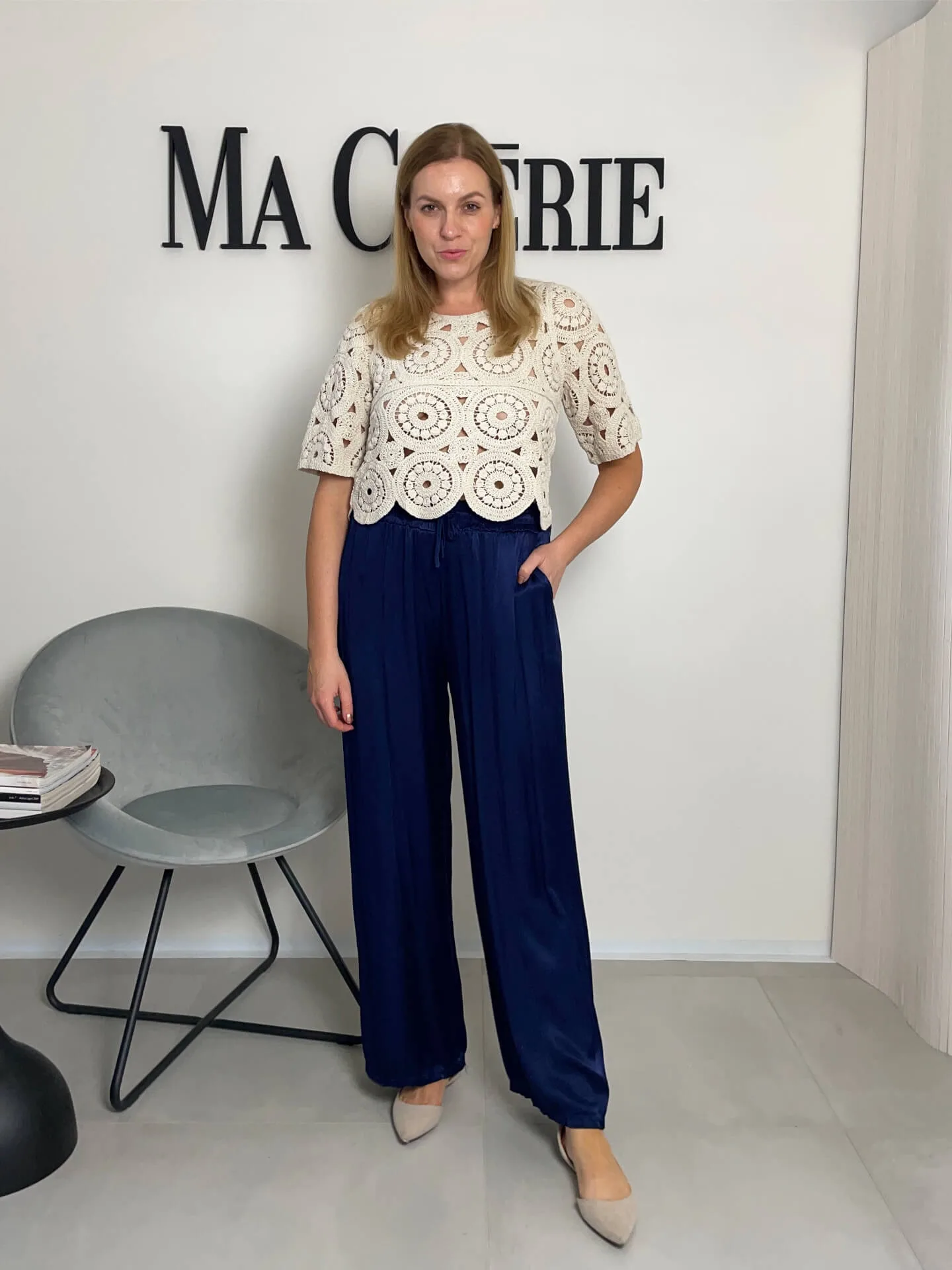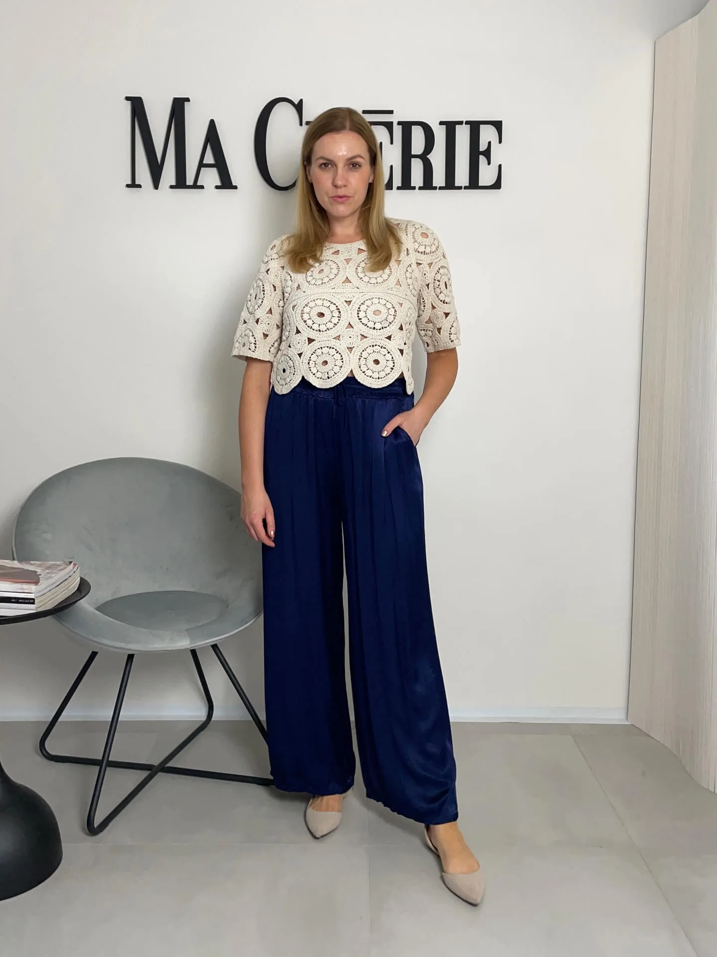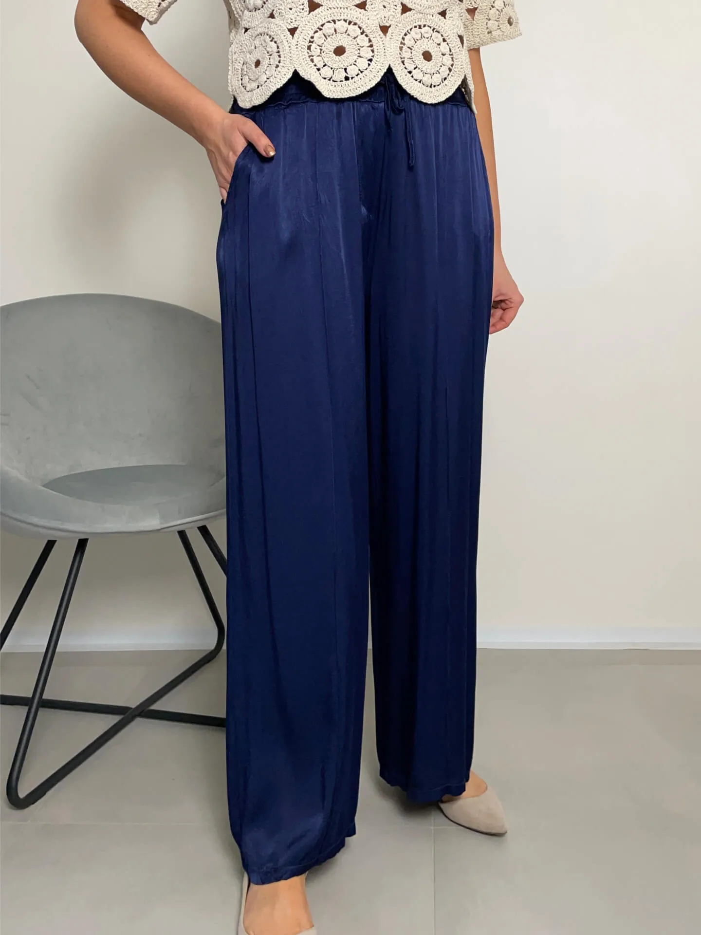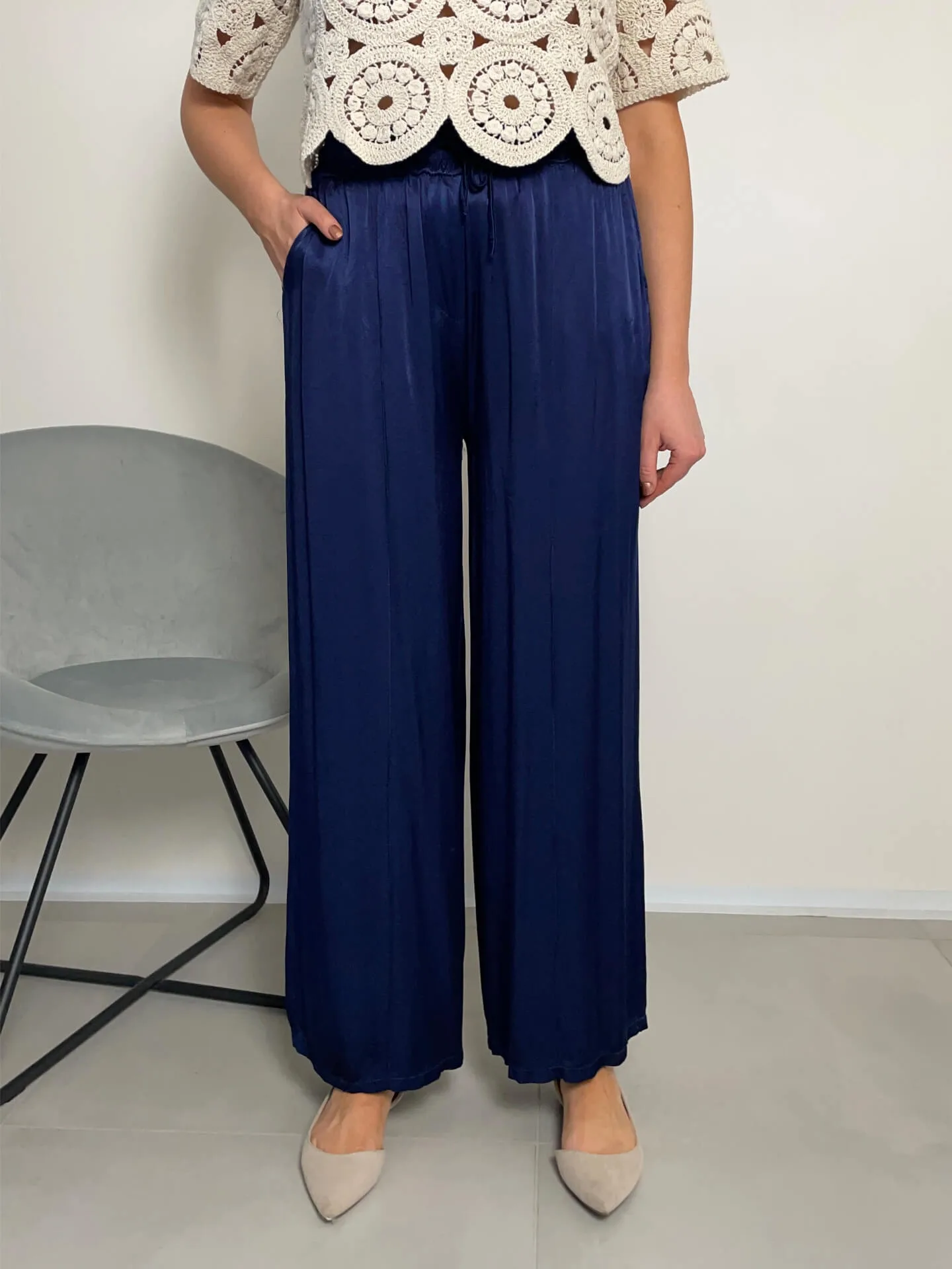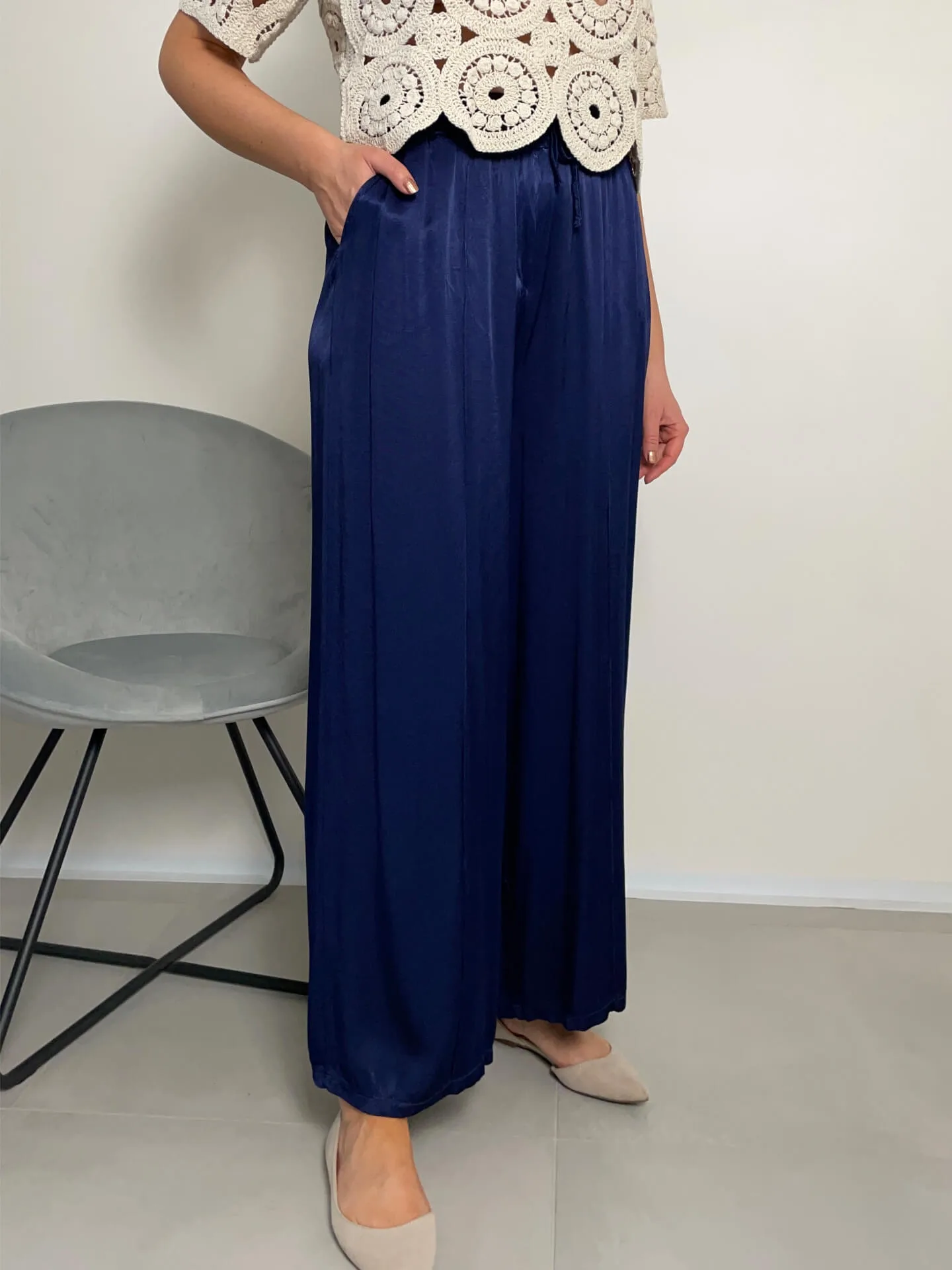 Široké lesklé kalhoty v tmavě modré barvě, extra pohodlné, ideální na léto, boční kapsy, v pase guma, příjemný chladivý materiál.