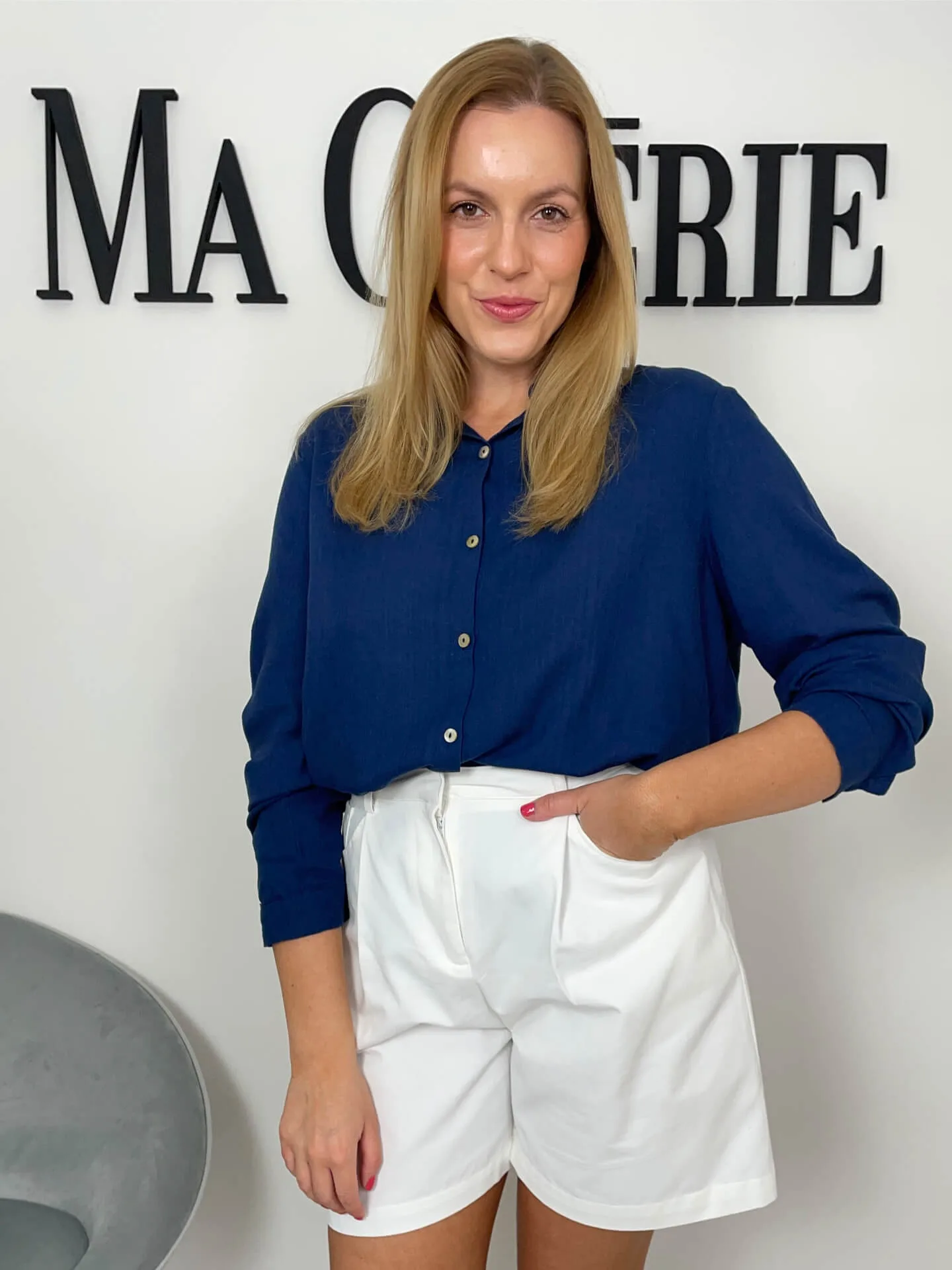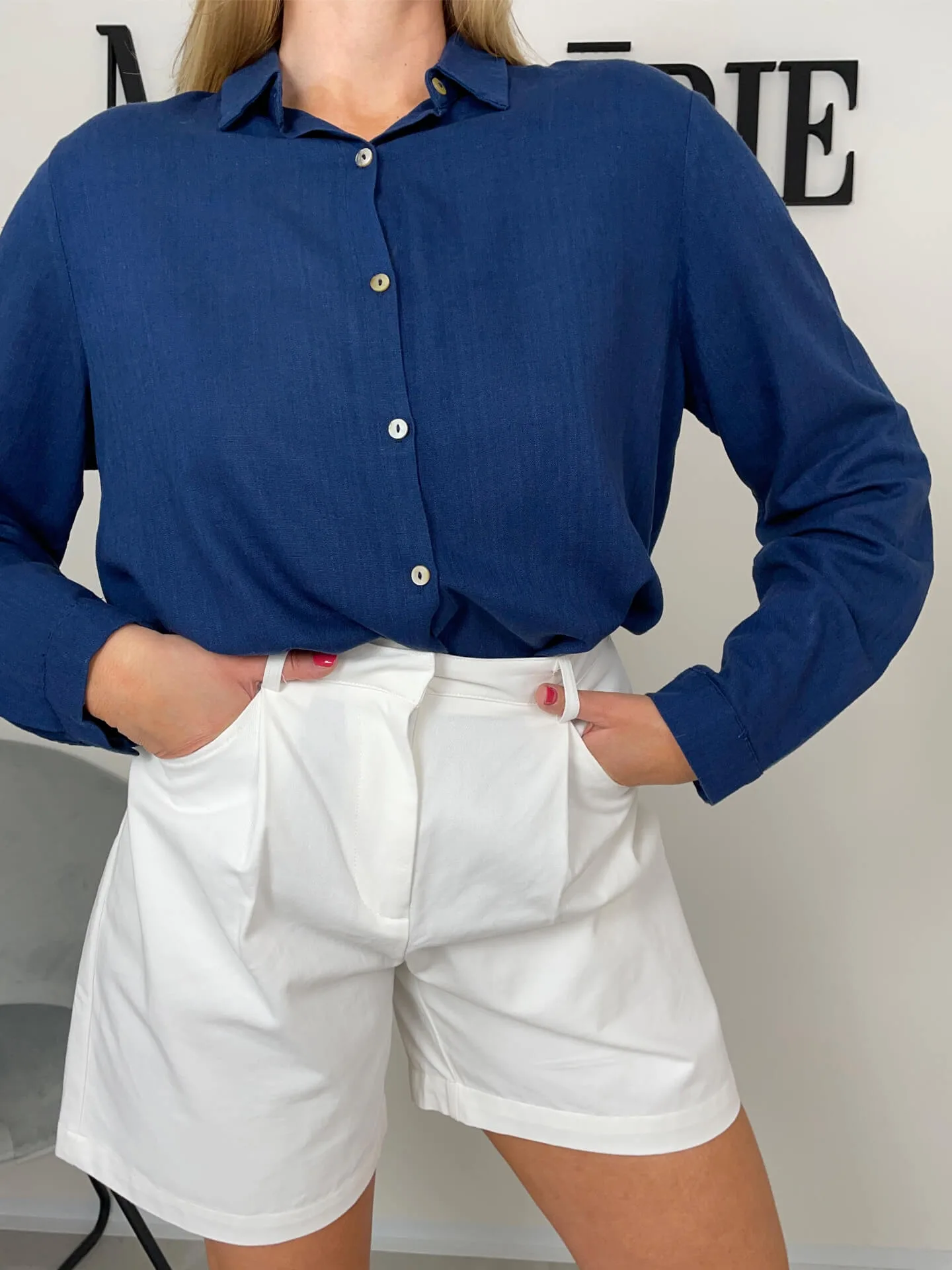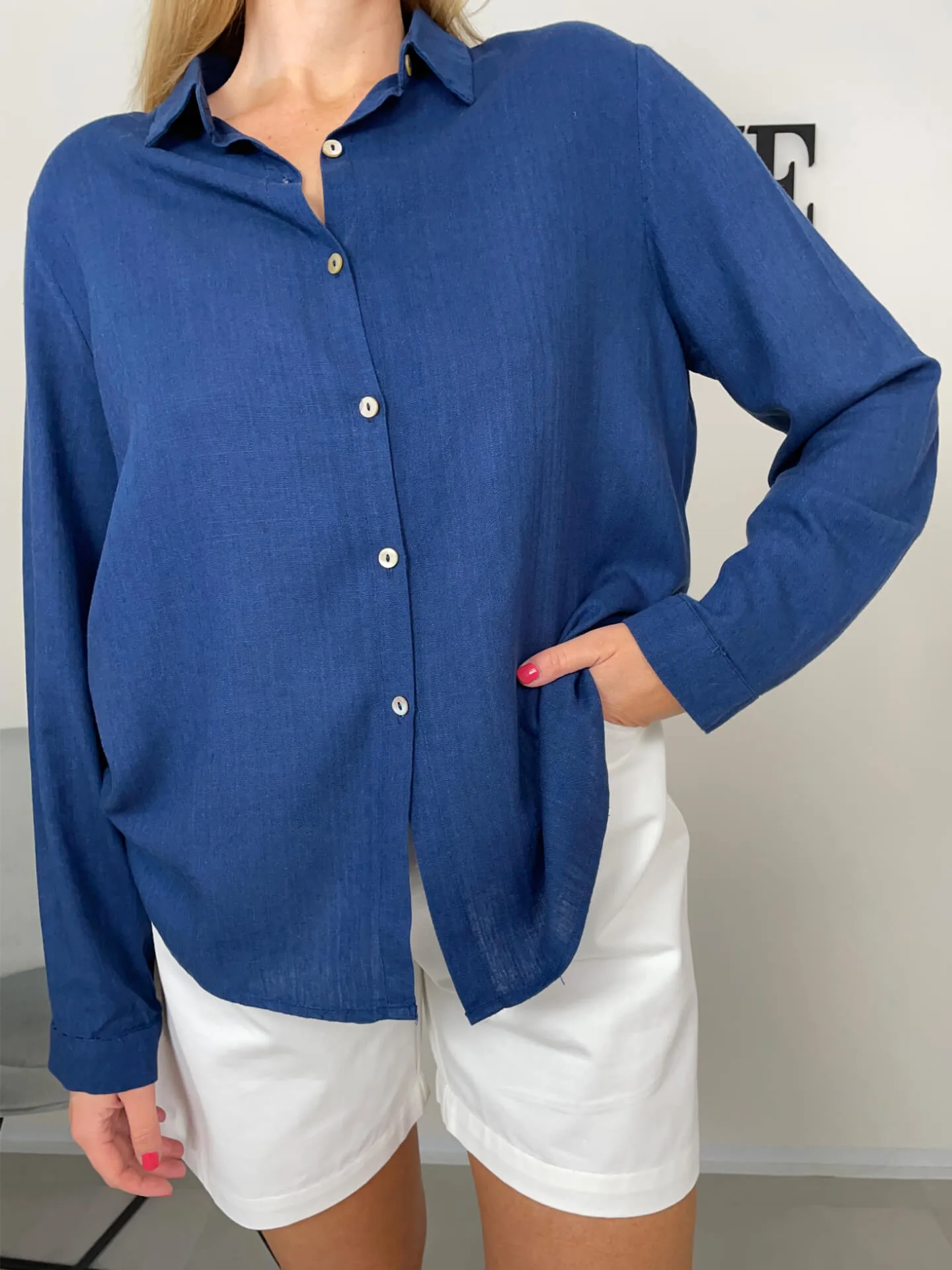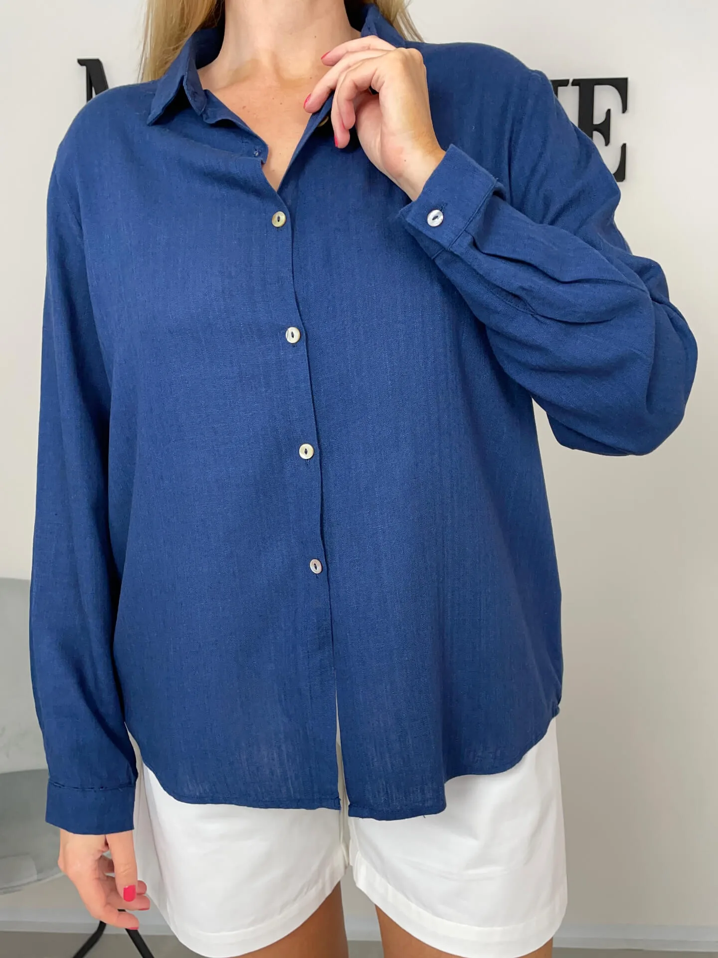 Tmavě modrá košile s dlouhým rukávem, krásná barva, klasická délka, zapínání na knoflíky.