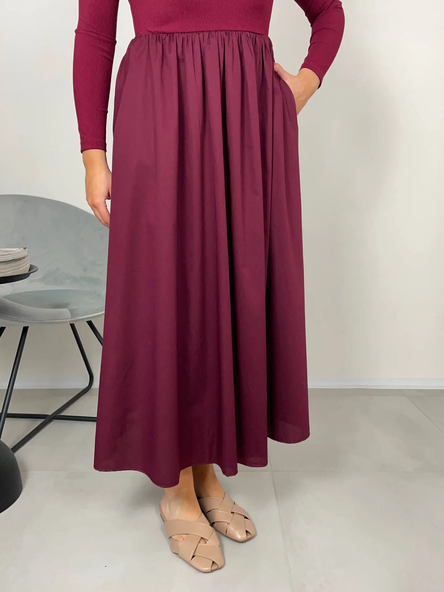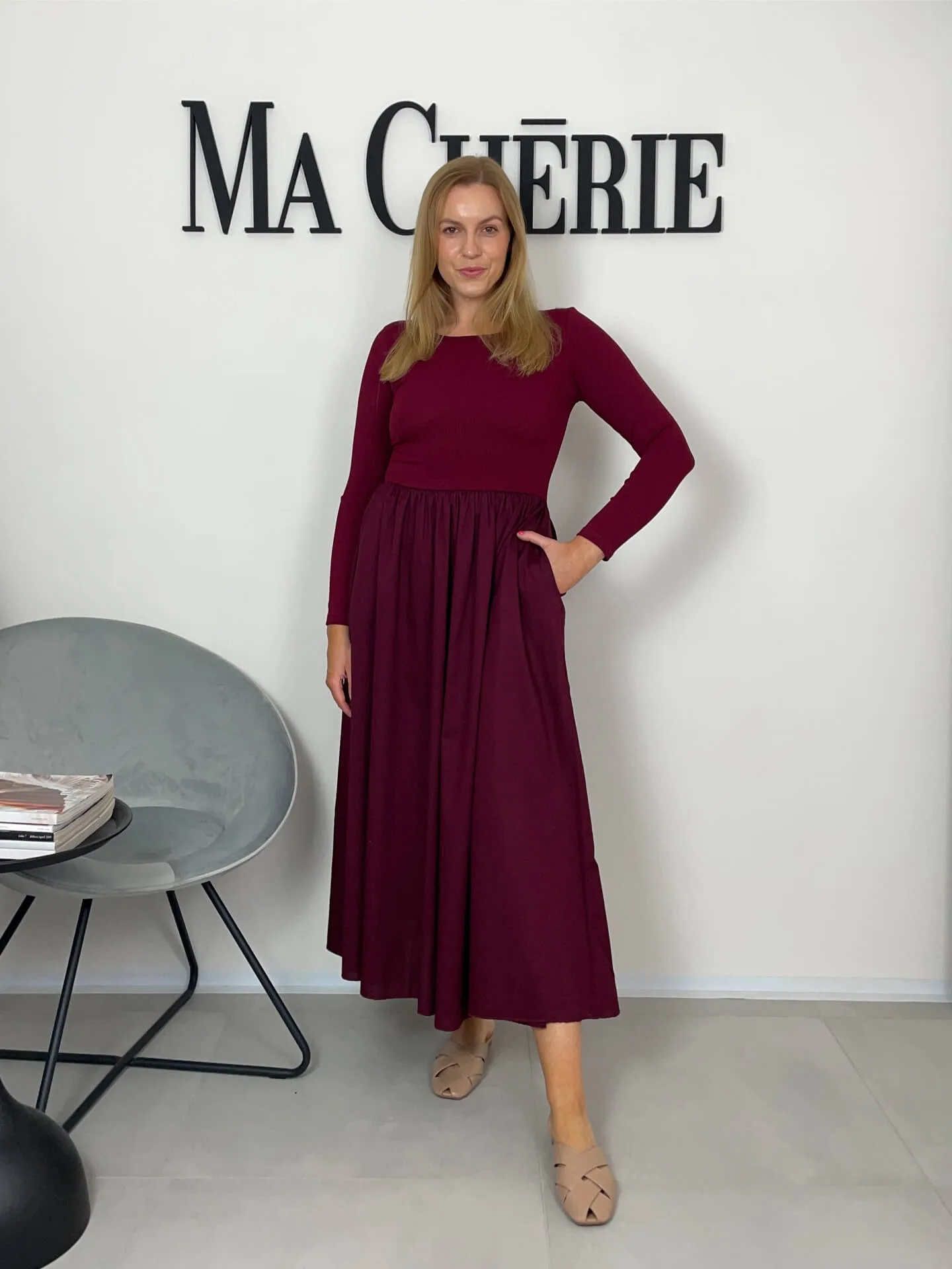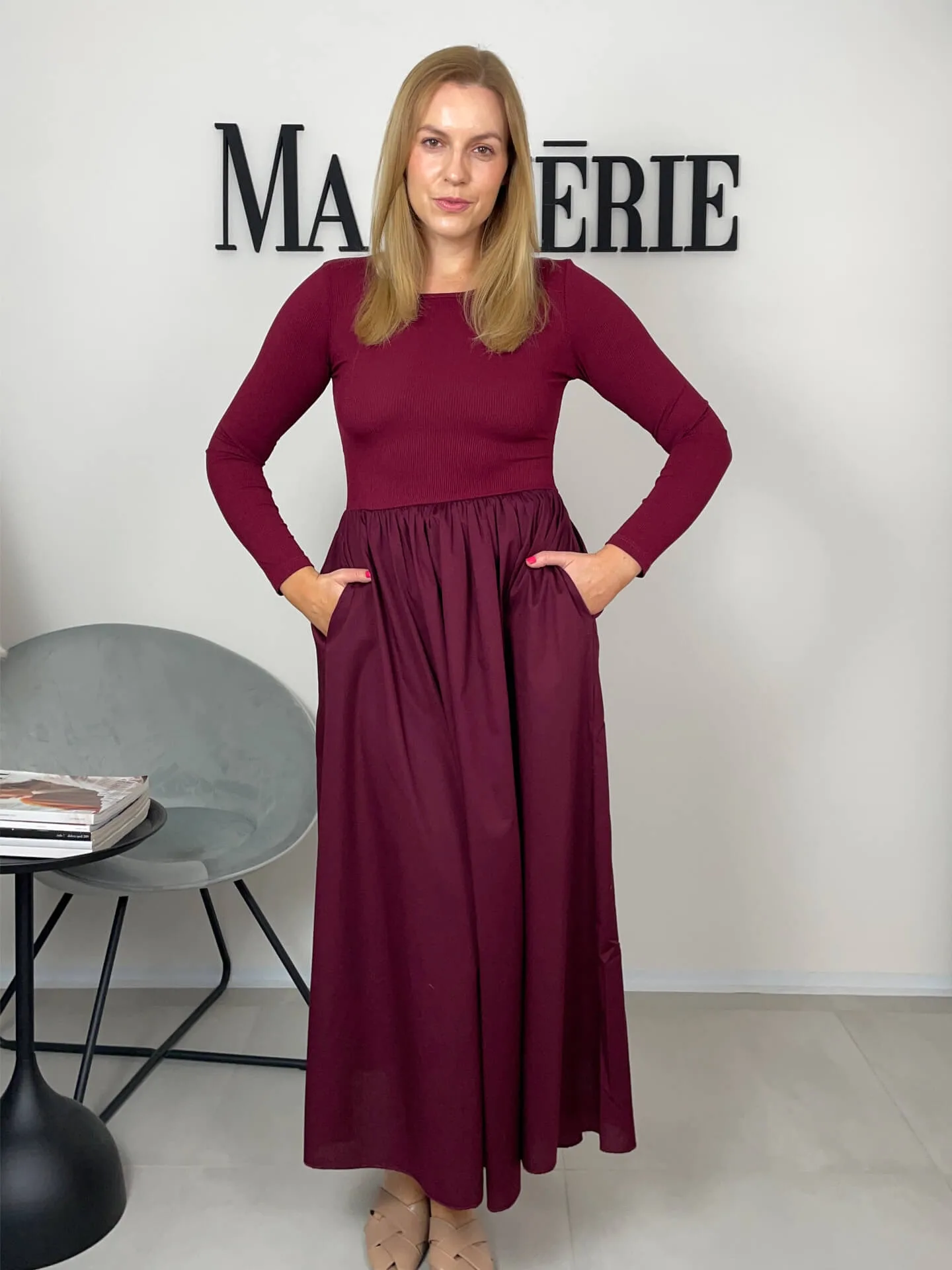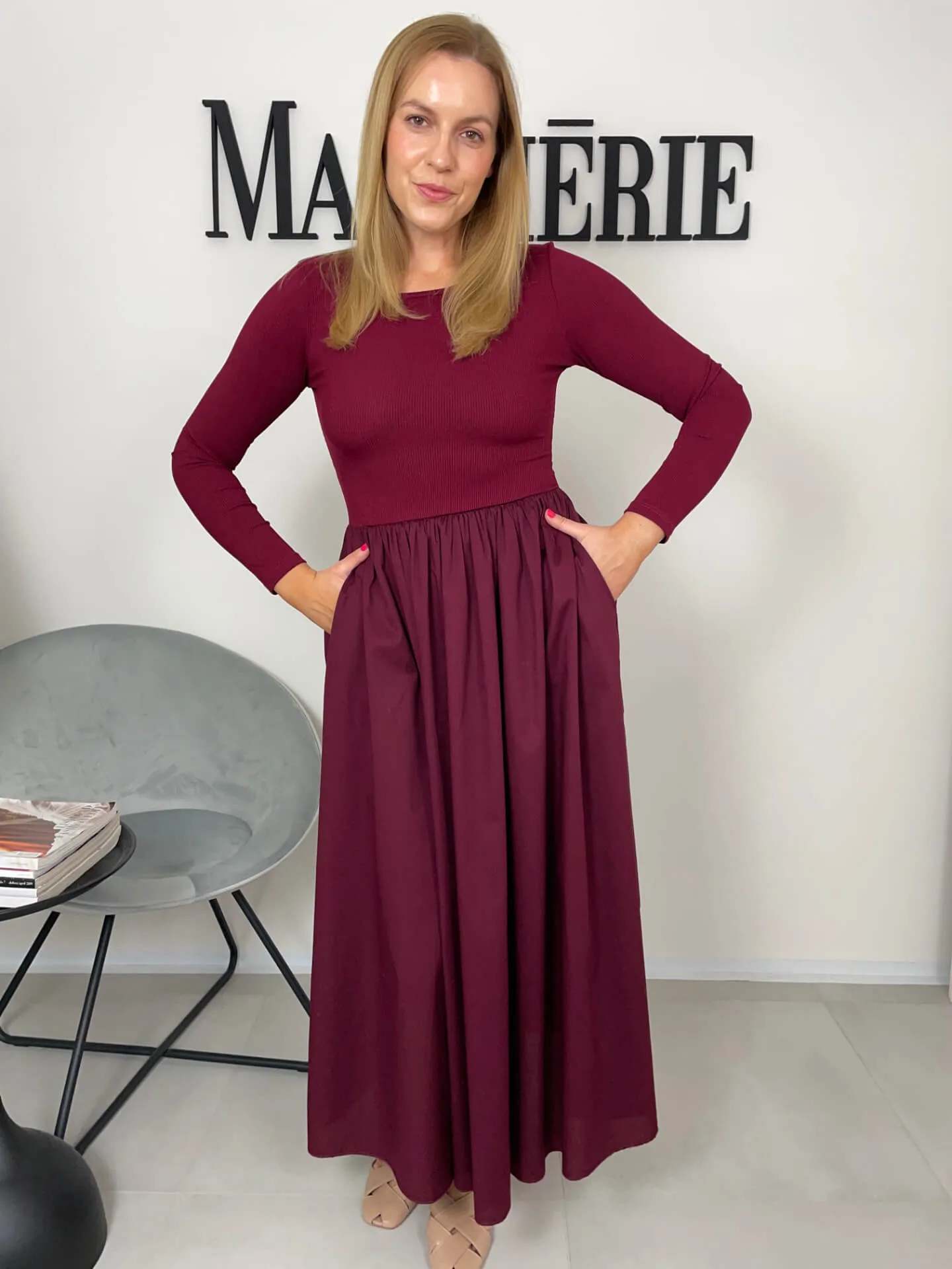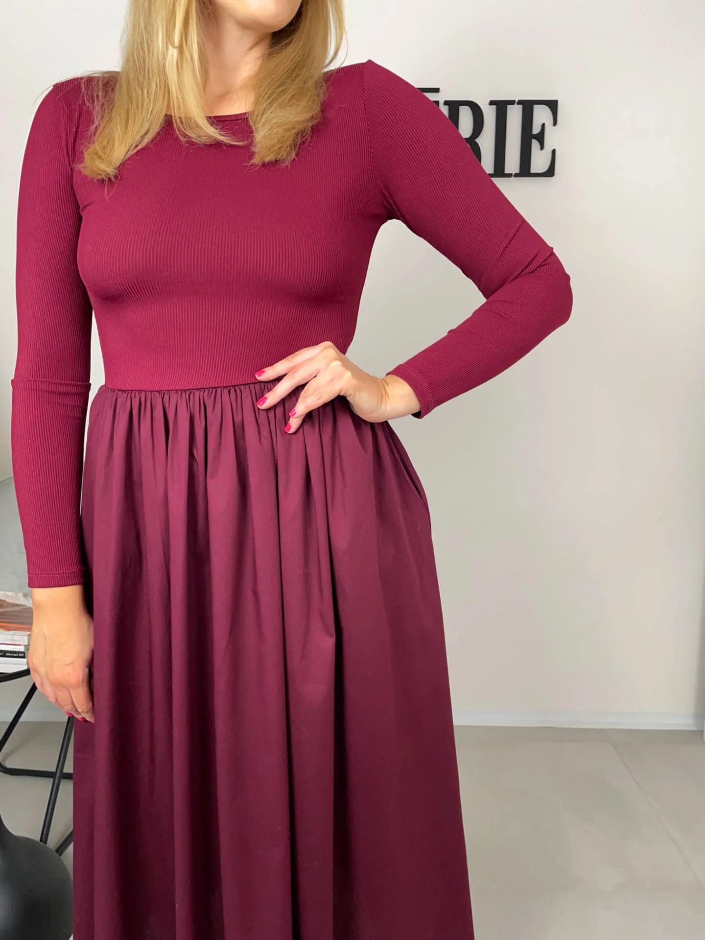 Pohodlné dlouhé šaty na každodenní nošení v aktuální bordó barvě, s dlouhým rukávem, horní tričková část je pružná, kulatý výstřih, sukně má postranní kapsy.