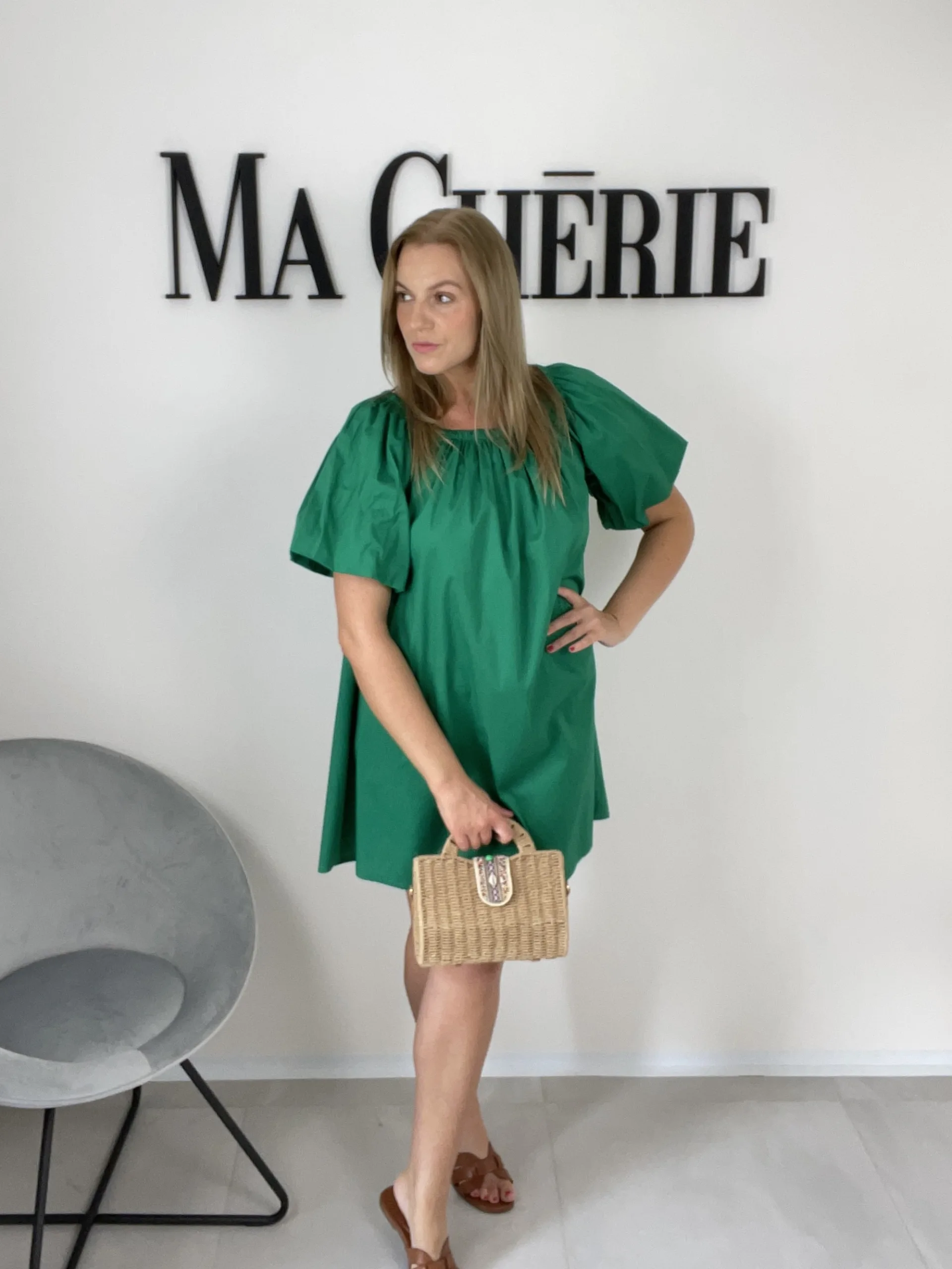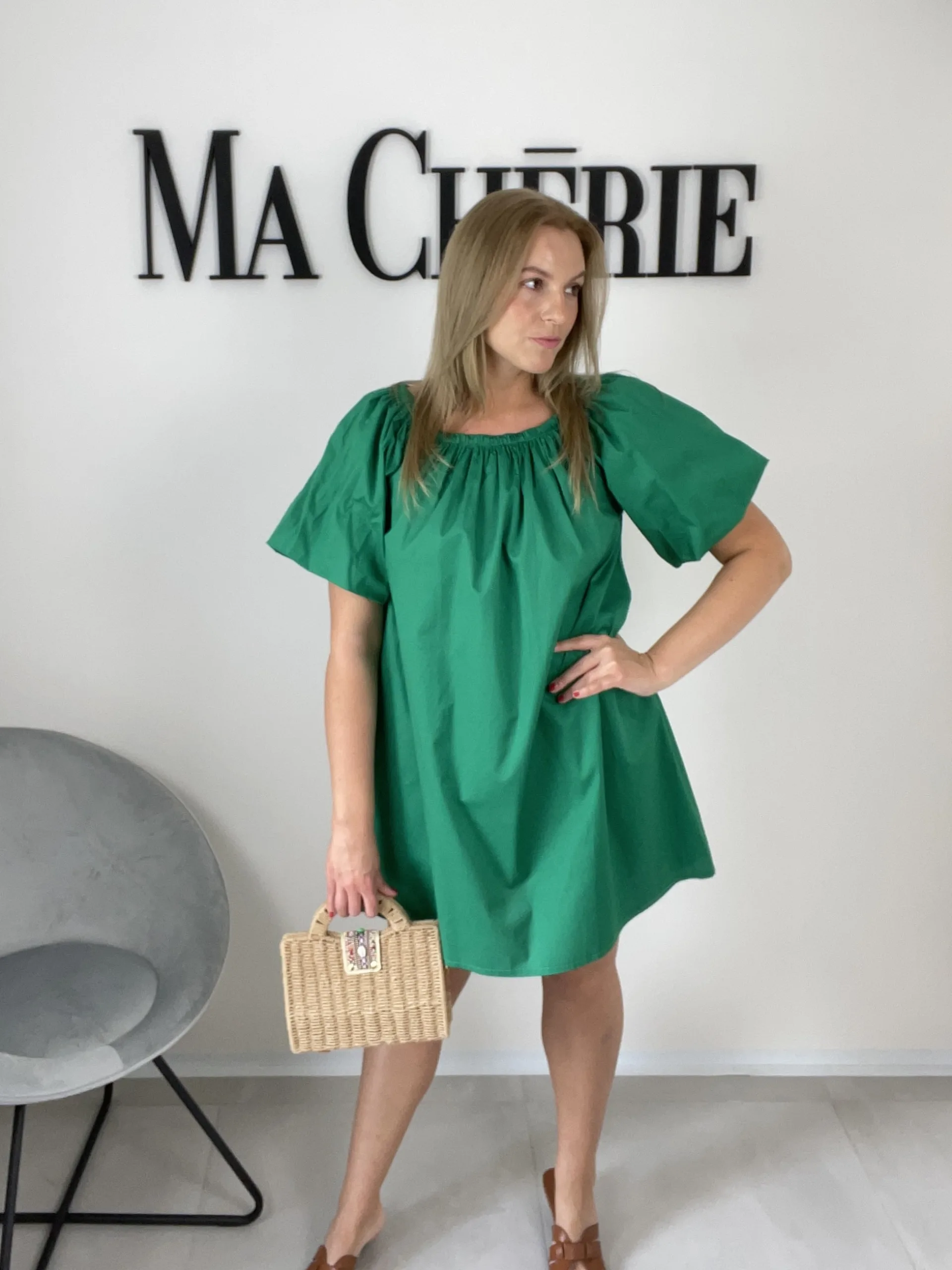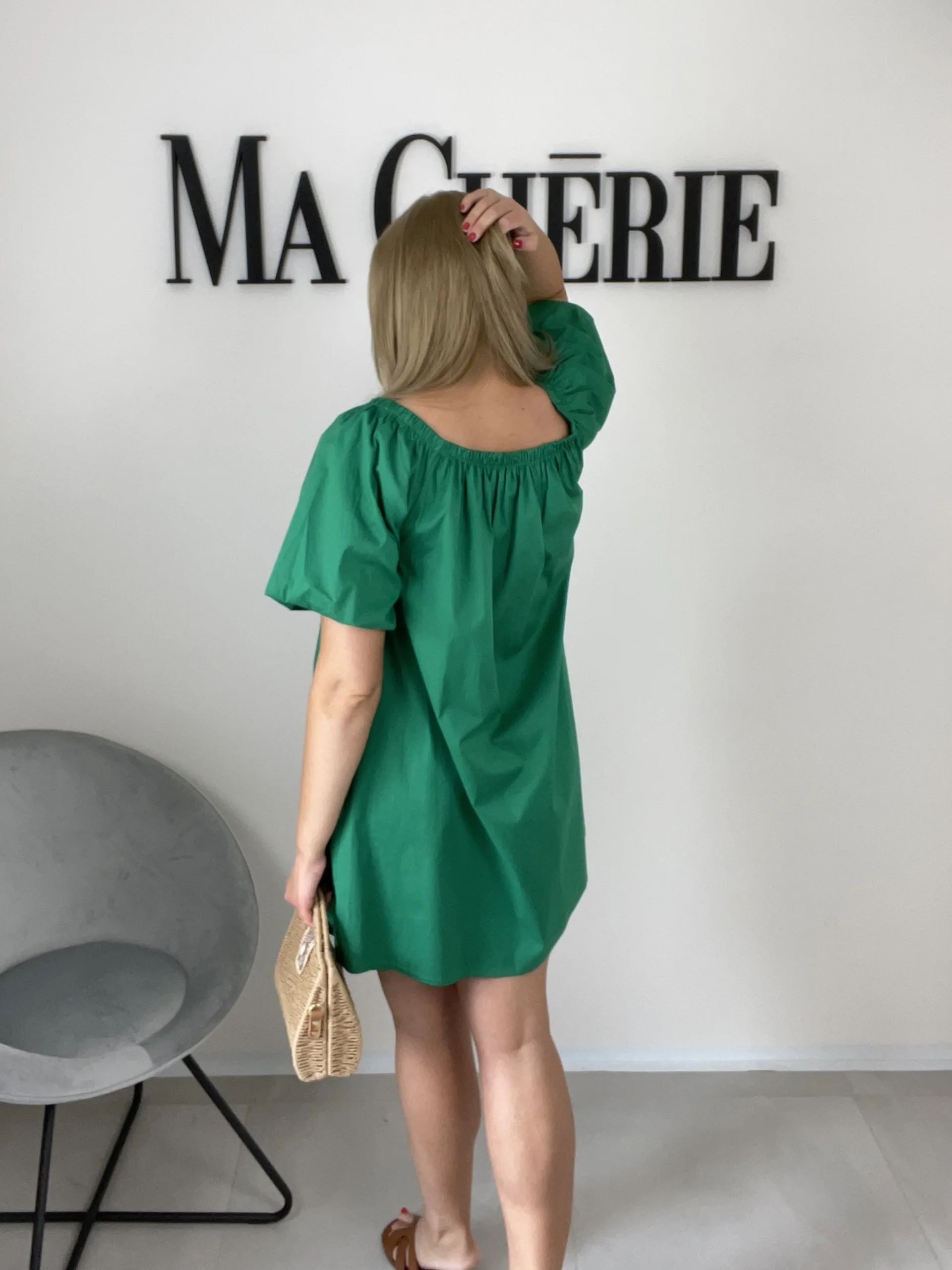 Vzdušné zelené krátké bavlněné šaty s nabíranými rukávy, střih do „A“, bez podšívky, v horní části okolo krku je pružná guma.